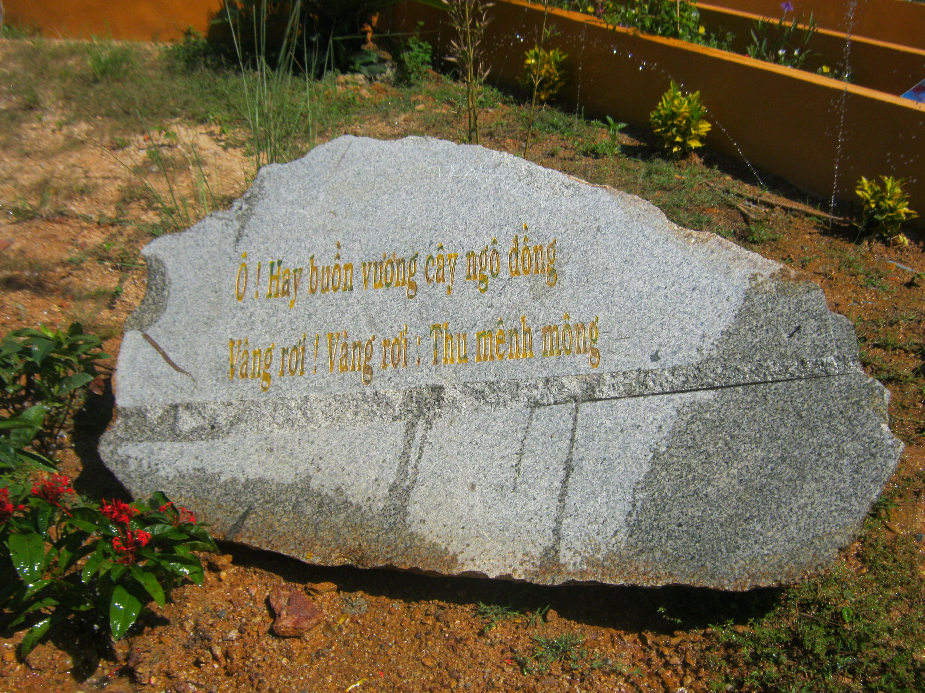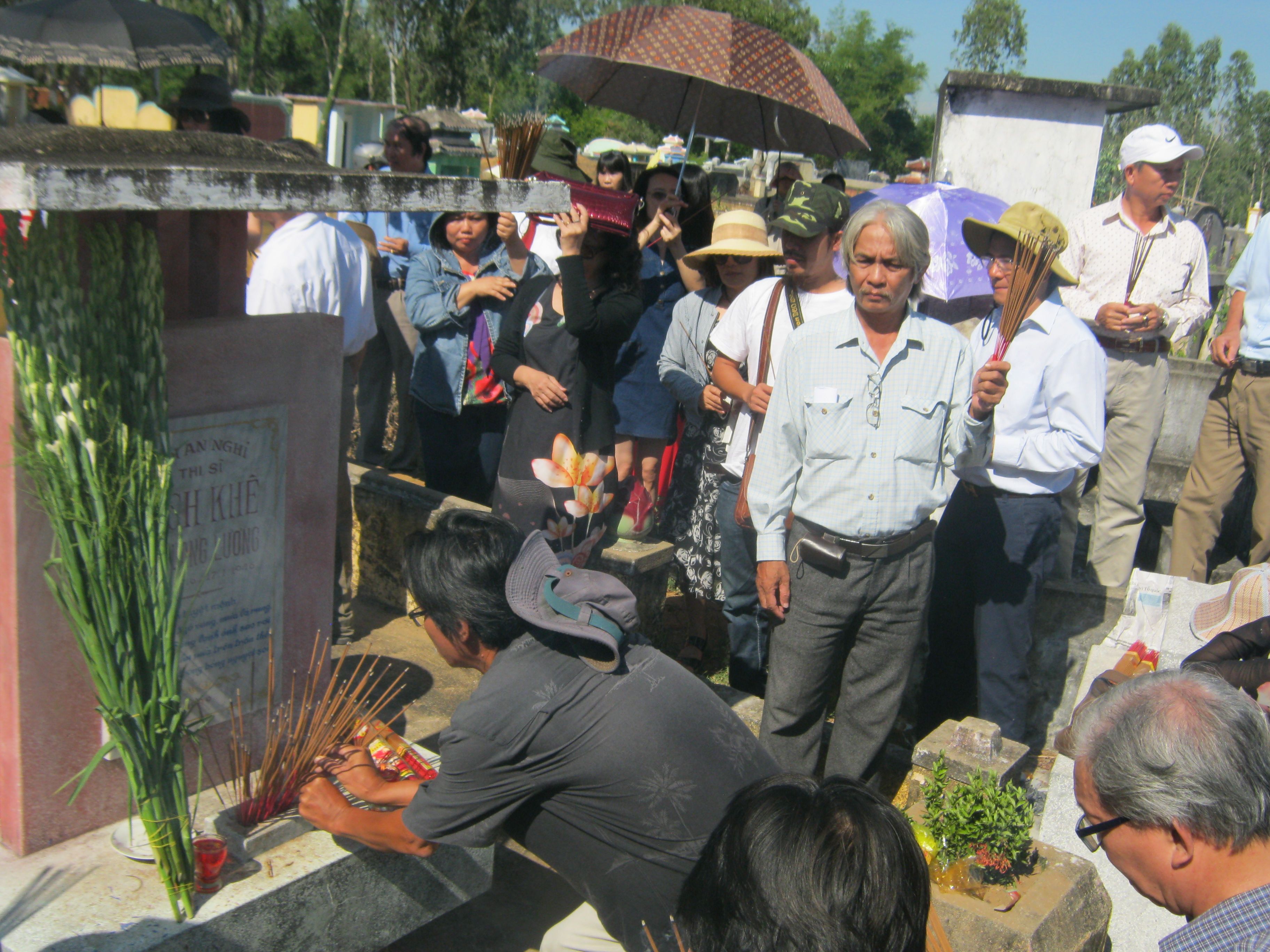 Buổi viếng mộ thi sĩ Bích Khê khá xúc động. Ông nằm đó 70 năm qua trong nghĩa địa làng bên cạnh bao mộ dân. Mộ xây đơn giản, khuôn hình đàn tì bà, cỏ xanh, chỉ phân biệt với những ngôi mộ vật liệu sang đẹp chung quanh ở tấm đá ghi 4 câu thơ trong bài “Lời tuyệt mệnh” của ông: “Thân bệnh: ngô vàng mưa lá rụng;/ Bút thần: sông lạnh ánh sao rơi,/ Sau nghìn thu nữa trên trần thế/ Hồn vẫn về trong bóng nguyệt soi”. Tôi, người viếng, có liên tưởng tới mộ Hàn Mặc Tử trên Đồi Thi nhân ở Quy Nhơn, Bình Định, bạn ông. Liên tưởng bởi sự gần nhau 2 thi tài mệnh bạc này, bởi những “long đong” của họ trong nhìn nhận hậu thế một thời.