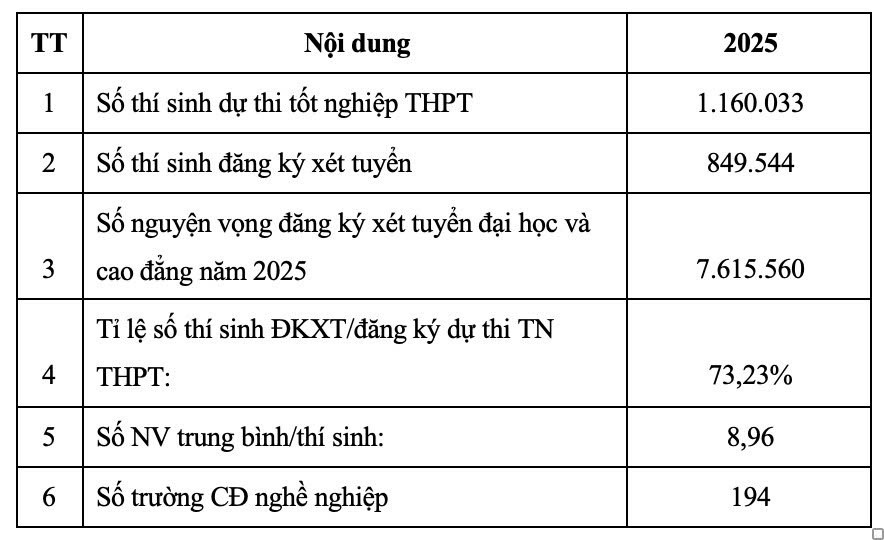 Số thí sinh đăng ký xét tuyển năm 2025 tăng 115.892 thí sinh (do có thí sinh đăng ký xét tuyển cả các trường cao đẳng nghề nghiệp).