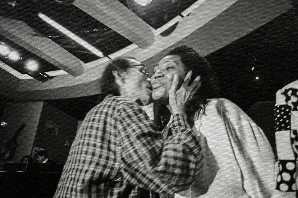 | Trịnh Công Sơn ôm hôn Liz Mitchell - ca sĩ chính của nhóm nhạc Boney M - khi bà lần đầu đến TP HCM biểu diễn năm 1994. |