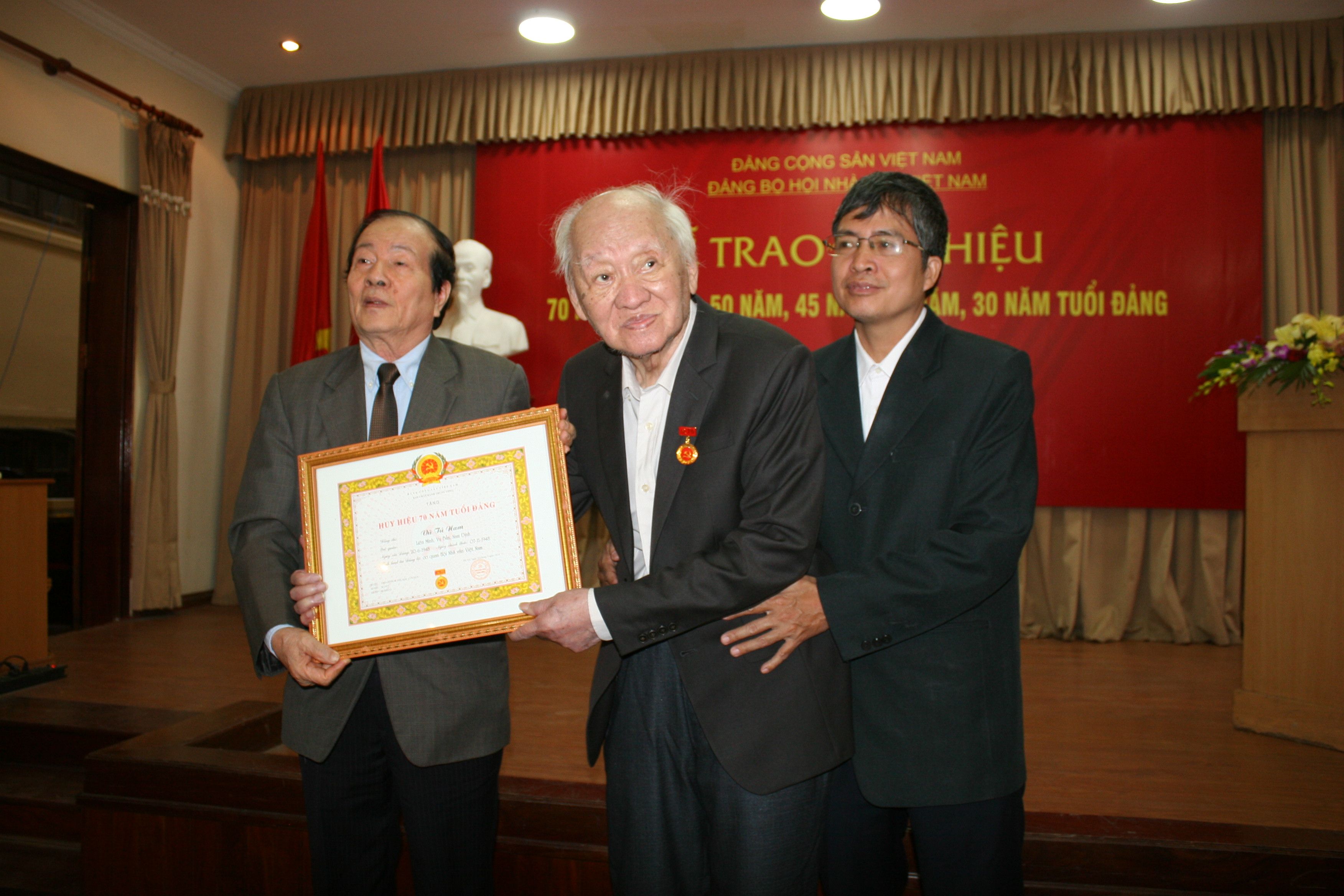 Thay mặt Đảng bộ Hội nhà văn Việt Nam, nhà thơ Hữu Thỉnh, Bí thư Đảng đoàn Hội nhà văn Việt Nam đã trao tặng Huy hiệu 70 năm tuổi đảng cho nhà văn Vũ Tú Nam ( các nhà văn còn lại Nguyễn Thị Cẩm Thạnh, do điều kiện sức khoẻ không tham dự; nhà văn Ngô Ngọc Bội vừa mất). Nhà văn Vũ Tú Nam, sinh năm 1929 tại thôn Lương Kiệt xã Liên Minh huyện Vụ Bản, tỉnh Nam Định. Ông thuộc lớp nhà văn gạo cội, từng kinh qua nhiều cương vị công tác khác nhau, tháng 6 năm 1958, ông được chuyển sang công tác tại báo Văn học của Hội nhà văn Việt Nam, ông lần lượt công tác tại các vị trí: Thư ký tòa soạn báo Văn học (nay là Văn Nghệ), Phó tổng biên tập báo Văn Nghệ, Giám đốc Nhà xuất bản Tác phẩm Mới (nay là Nhà xuất bản Hội Nhà Văn). Ông cũng được bầu làm Ủy viên Ban chấp hành Hội Nhà văn Việt Nam các khóa I, II, III, IV, Tổng thư ký Hội Nhà văn Việt Nam khóa IV. Nhận Huy hiệu 70 năm tuổi Đảng, nhà thơ Vũ Tú Nam không phát biểu, nhưng sự xúc động hiện lên rất rõ trong đôi mắt của nhà văn- đảng viên lão thành cách mạng.