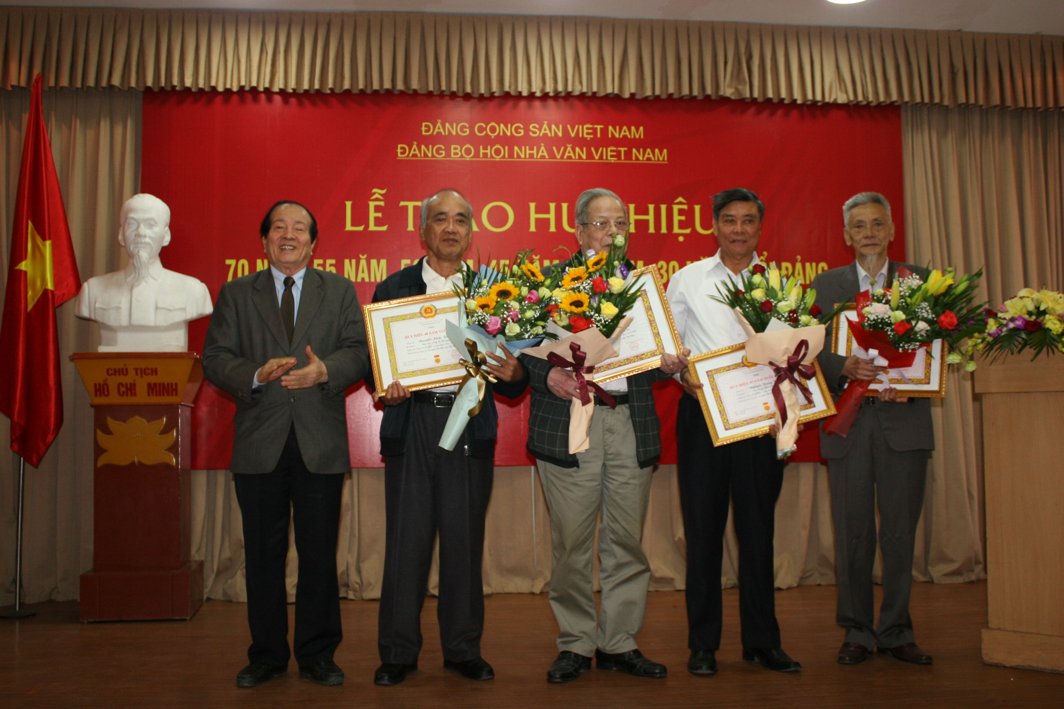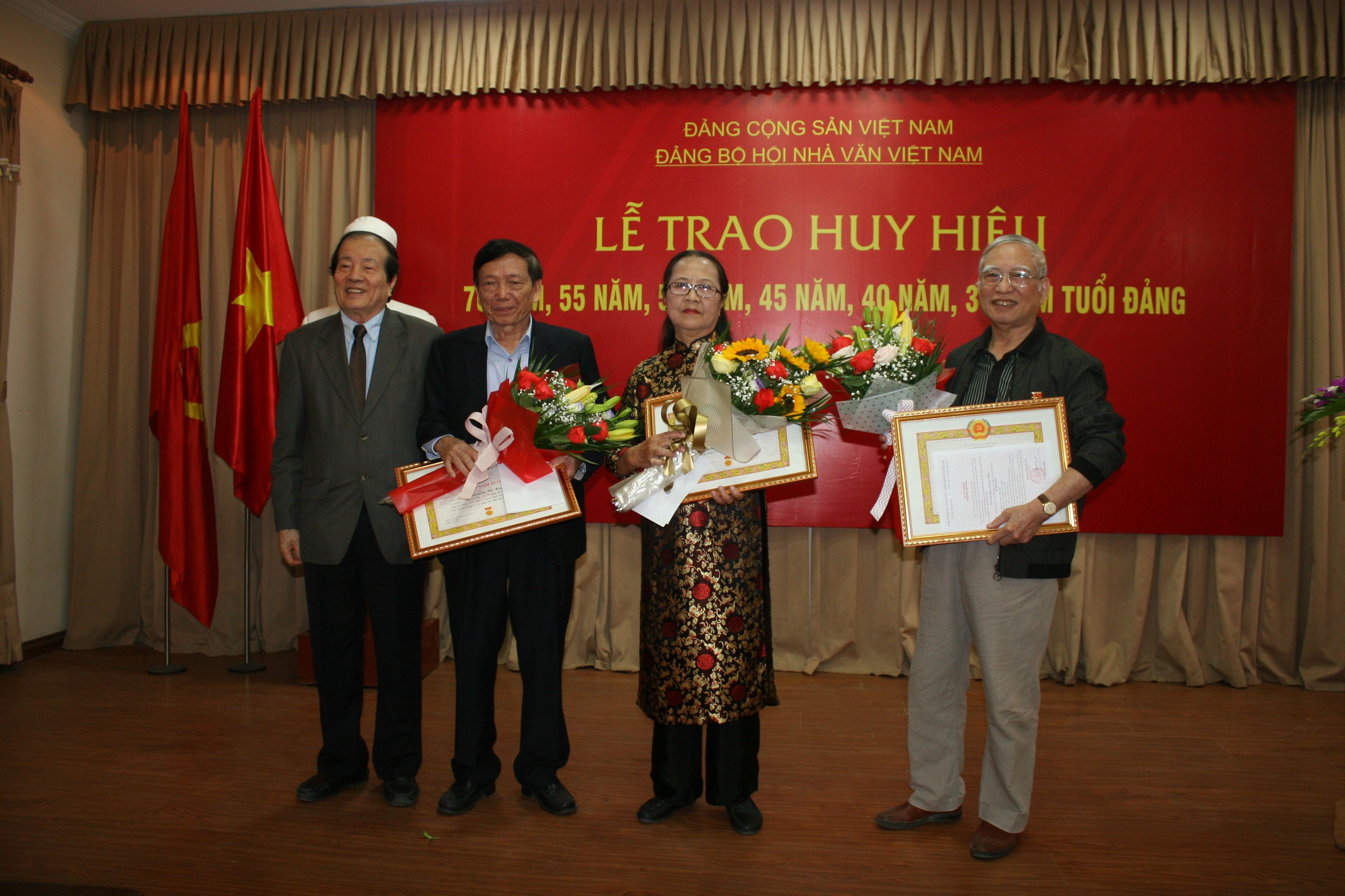 Trong lễ trao tặng Huy hiệu cao quý của Đảng năm nay, Đảng bộ Hội nhà văn Việt Nam có 3 đảng viên lão thành được nhận huy hiệu 70 năm tuổi Đảng, 1 đồng chí nhận Huy hiệu 55 năm tuổi đảng, 3 đồng chí nhận Huy hiệu 50 năm, 3 đồng chí nhận Huy hiệu 45 năm tuổi đảng và 2 đồng chí nhận Huy hiệu 30 năm tuổi đảng.