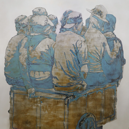 Tác phẩm của Cao Văn Thục mang tên Gắn kết tạm thời, được sáng tác bằng chất liệu sơn mài và kỹ thuật ăn mòn axit trên hợp kim nhôm. Họa sĩ khắc họa hình ảnh một nhóm người lao động trên thùng xe tải. Những cử chỉ ôm ghì, bám víu lấy nhau thể hiện cả sự che chở, gắn kết lẫn sự mong manh nơi đất khách. Hình khối của nhóm người tạo thành một hình vuông ở trung tâm, nhưng một góc bị khuyết như một phép ẩn dụ cho kiếp sống chênh vênh trong hành trình mưu sinh.