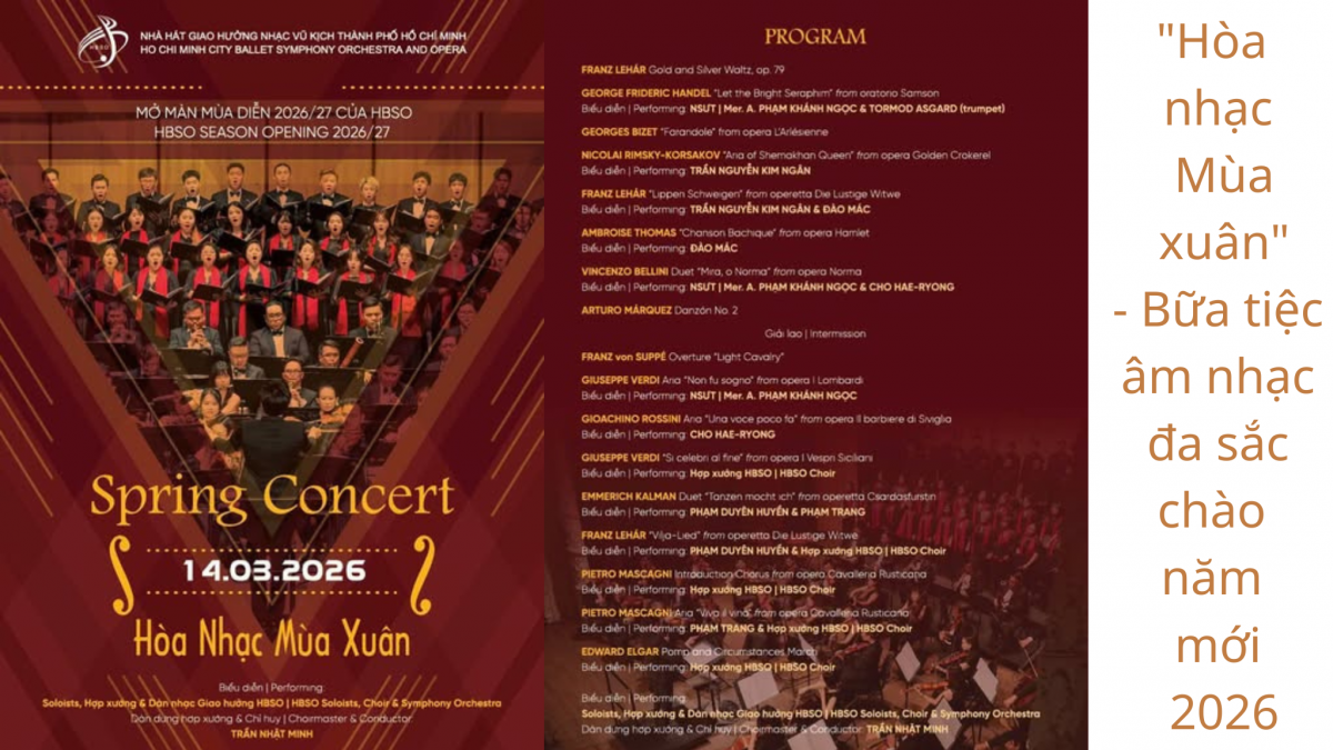 - Sang phần hai, không khí khán phòng sẽ trở nên bùng nổ hơn với khúc ouverture Light Cavalry cùng chuỗi trích đoạn opera nổi tiếng của Giuseppe Verdi và Gioachino Rossini… BTC cho biết, ở phần hai này, khán phòng bừng sáng với khúc ouverture Light Cavalry của Franz von Suppé – bản nhạc quen thuộc với tiết tấu nhanh và tinh thần vui tươi đặc trưng của operetta thế kỷ XIX. NSƯT Phạm Khánh Ngọc tiếp tục tỏa sáng với aria Non fu sogno từ opera I Lombardi của Giuseppe Verdi với giai điệu trang nghiêm và đầy nội lực. Nối tiếp, nghệ sĩ Cho Hae-Ryong mang đến sắc thái duyên dáng qua aria Una voce poco fa từ Il barbiere di Siviglia của Gioachino Rossini – màn trình diễn đòi hỏi sự linh hoạt và cá tính sân khấu sống động. Tinh thần hợp xướng hùng tráng vang lên trong khúc ca chiến thắng đầy khí thế Si celebri al fine trích vở opera I Vespri Siciliani của Giuseppe Verdi. Khán giả sẽ được đắm mình trong vẻ đẹp trữ tình của Vilja-Lied từ operetta Die lustige Witwe của Franz Lehár, do Duyên Huyền và hợp xướng thể hiện – khúc ca mềm mại như làn gió xuân. Khán giả sẽ được đắm mình trong vẻ đẹp trữ tình của Vilja-Lied trích vở operetta Die Lustige Witwe của Franz Lehár do nghệ sĩ Duyên Huyền và hợp xướng thể hiện.