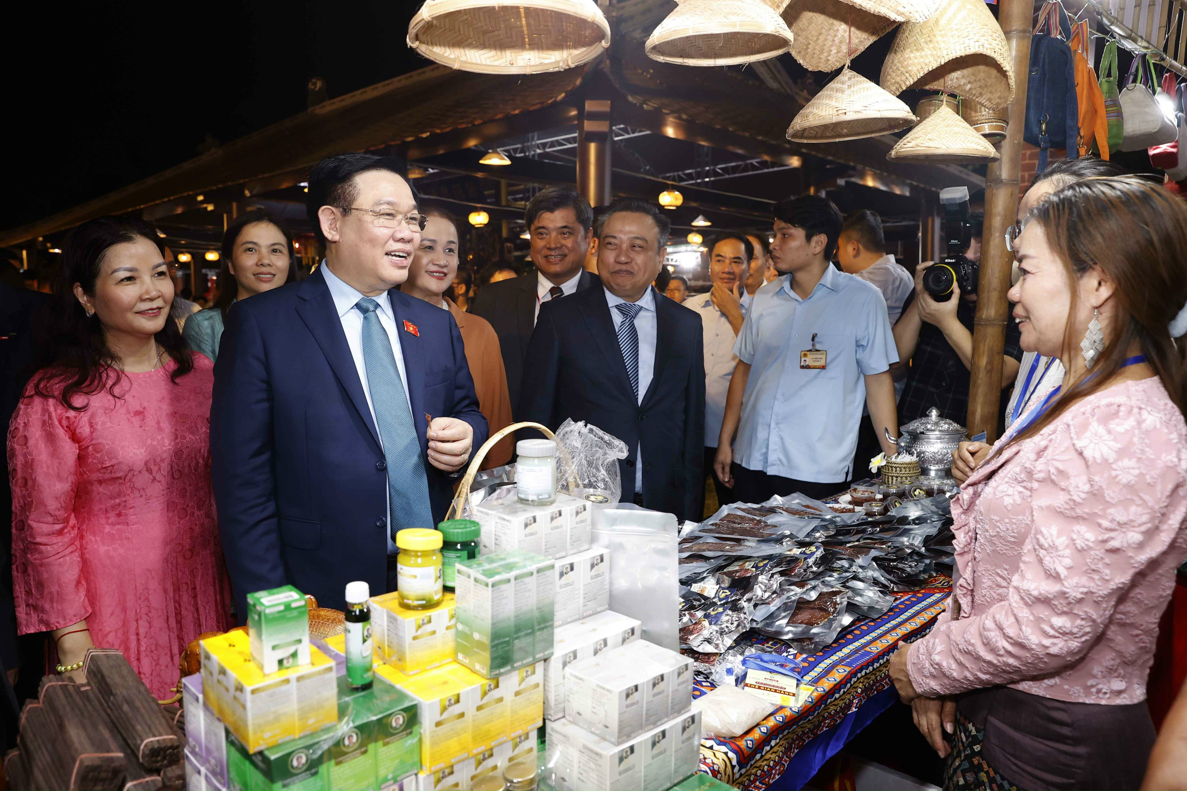 | Chủ tịch Quốc hội Vương Đình Huệ cùng các đồng chí lãnh đạo và đại biểu đi thăm gian trưng bày sản phẩm trong buổi khai mạc |