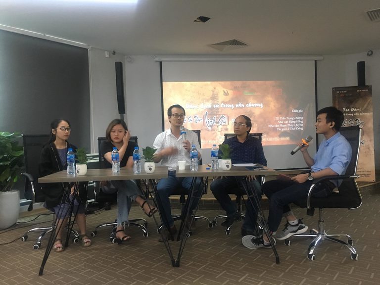 Các diễn giả tại tọa đàm Lịch sử trong văn chương - Từ sự thực lịch sử tới hư cấu Những tác phẩm văn chương có yếu tố lịch sử là những tác phẩm vừa truyền tải được thông điệp lịch sử vừa có tư tưởng, triết lí của nhà văn. Tuy vậy, ranh giới giữa sự thật lịch sử và hư cấu trong văn chương luôn tồn tại ở các tác phẩm có liên quan tới lịch sử. Đâu là sự thật lịch sử và đâu là giới hạn hư cấu của nhà văn, đó là điều mà độc giả và giới chuyên môn luôn quan tâm và vẫn muốn tìm ra trong mỗi tác phẩm.