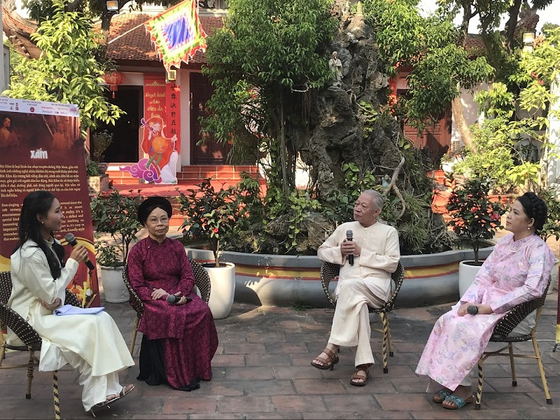 | NSND Đoàn Thanh Bình (áo đỏ, bên trái), NSND Xuân Hoạch (ở giữa), Nghệ nhân Tạ Hạnh (áo hồng) chia sẻ về âm nhạc truyền thống |