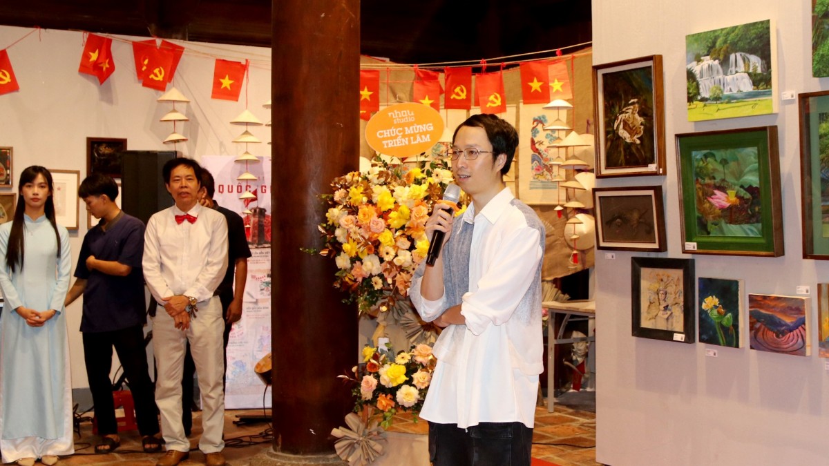 | Họa sĩ Đinh Quang Huy - Nhà sáng lập Câu lạc bộ Tôi vẽ phát biểu tại lễ khai mạc triển lãm |