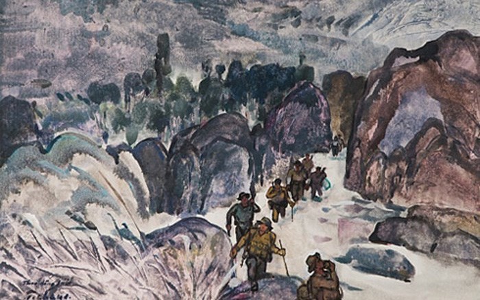| Tác phẩm Đường Trường Sơn theo dòng suối, 1995 - Thuốc nước trên giấy, 64 x 80 cm - họa sĩ Nguyễn Thanh Châu |