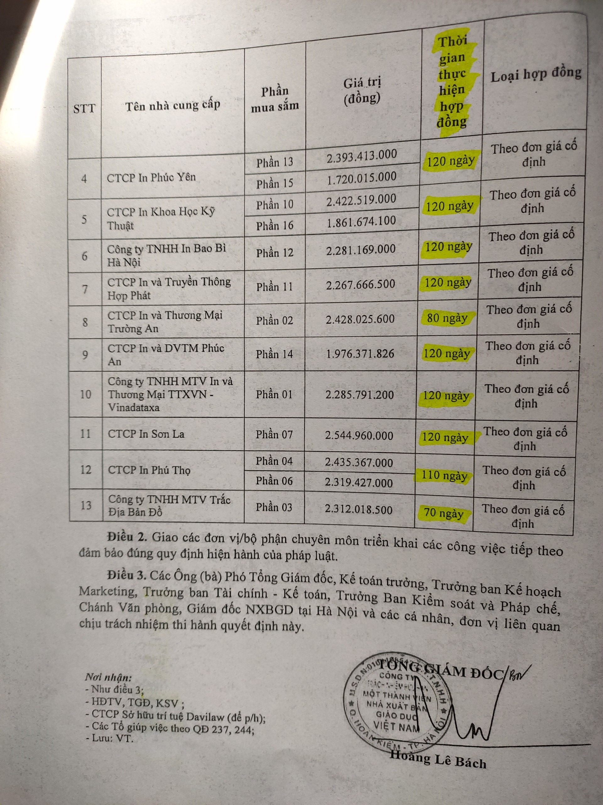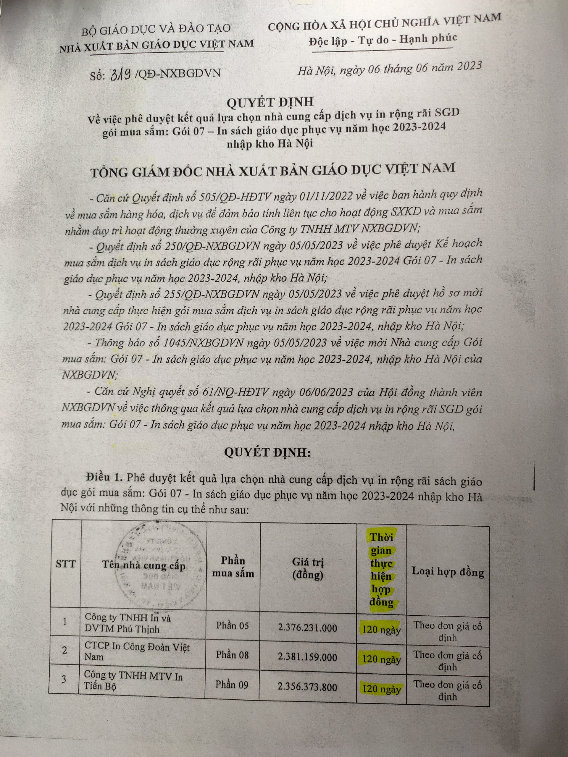 Theo thời hạn nêu trong các Quyết định số 319, 309, 320, 310, 323, 324, 325 các ngày 30/05, ngày 06/06 và 07/6/2023 của NXB Giáo dục Việt Nam về việc phê duyệt kết quả lựa chọn nhà cung cấp dịch vụ in SGK lớp 4, 8, 11 của cả 2 bộ sách Kết nối và Chân trời Sáng tạo phục vụ năm học 2023-2034 nhập các kho Hà Nội, Đà Nẵng, TP. Hồ Chí Minh, Cần Thơ thì sớm nhất là 4 tháng nữa mới có đủ sách vì hầu hết thời gian hoàn thành hợp đồng in là 120 ngày.