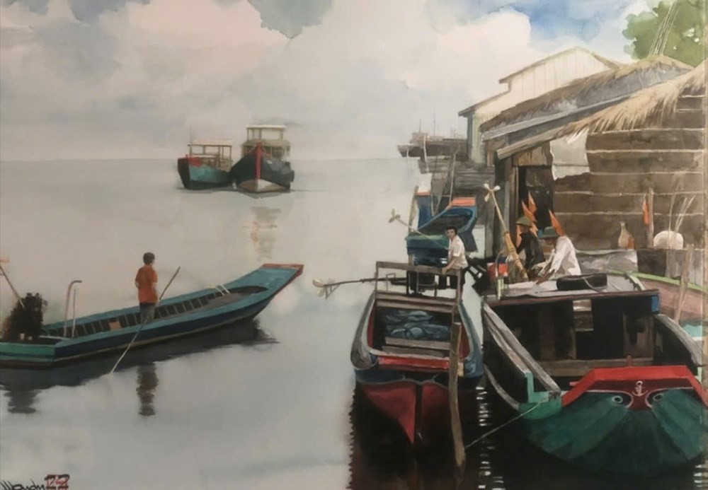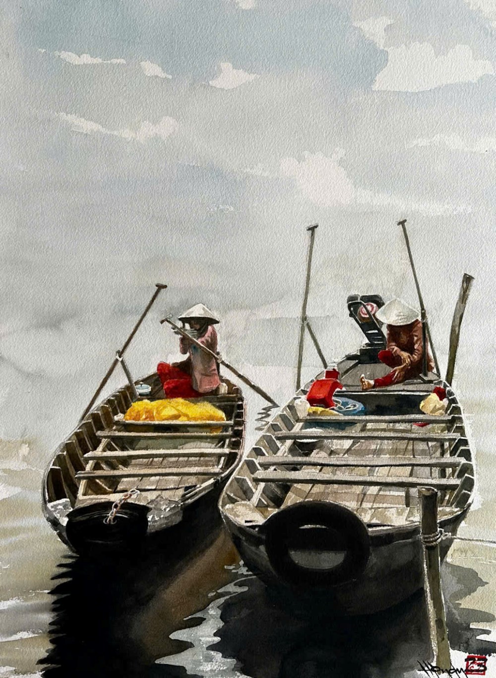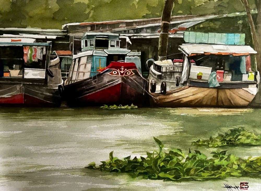 Và vì vậy, với anh, vẽ màu nước là cách sống chậm lại, thở cùng nhịp sông, gìn giữ những hình ảnh tưởng chừng dễ trôi tuột theo thời gian. Anh không vẽ để làm đẹp cho đời, mà để lưu giữ bóng quê, ánh sáng, những chiếc ghe cũ, mái tóc bạc bên dòng nước chiều và buổi bình minh miền châu thổ.