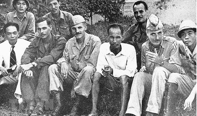 | Lãnh tụ Hồ Chí Minh cùng một số thành viên nhóm tình báo Con Nai, Mỹ, tại Tân Trào năm 1945. Ảnh: Tư liệu |