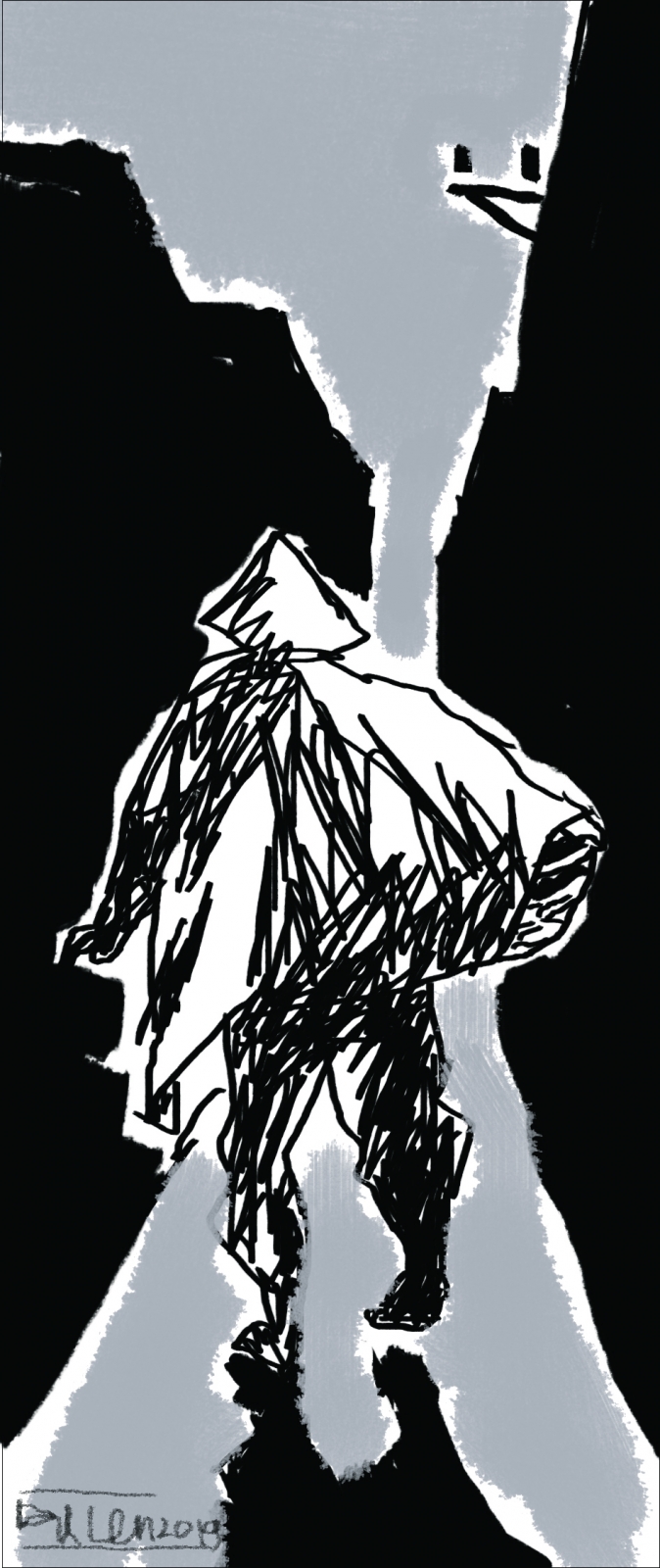Gặp một con đường thông ra đại lộ. Đứng ở ngã ba nhìn vào bà có cảm giác tuyến đường này thế nào cũng có nhà đã thức dậy. Bà không biết con đường này mang tên gì, tuy cũng cố nhìn nhưng không rõ. Mắt với chả mũi. Bà trách đôi mắt rồi tự bảo đã đến nước này thì tao cũng chả cần biết tên mày làm gì. Có thể là Gió Lộng. Có thể lắm vì gió ở đây không thổi qua được chiều cao những tòa nhà đành đi xuống lòng đường. Lòng đường như một ống hút khổng lồ làm cho sương mù rợn lên, cuồn cuộn, hun hút, đẫm hơi nước, thổi tung chiếc áo mưa bà đang khoác trên người. Tuy có chút lo lắng nhưng bà vẫn cố ghi nhớ đặc điểm con đường phòng khi trở lại. Tuyến này nhỏ hơn và hai bên là những tòa nhà không khác mấy những tòa nhà trên đại lộ nhưng bà thấy nó có vẻ Thực dân hơn. Phía trước, bên phải có ánh đèn vừa bật sáng, mặc dù còn cách đó mấy chục mét bà còn nghe rõ tiếng cuốn cửa. Bà vô cùng mừng rỡ, đôi chân cũng linh hoạt và có vẻ hơi cuống. Bà đi rất nhanh, chính xác là chạy. Bà bắt đầu rao: