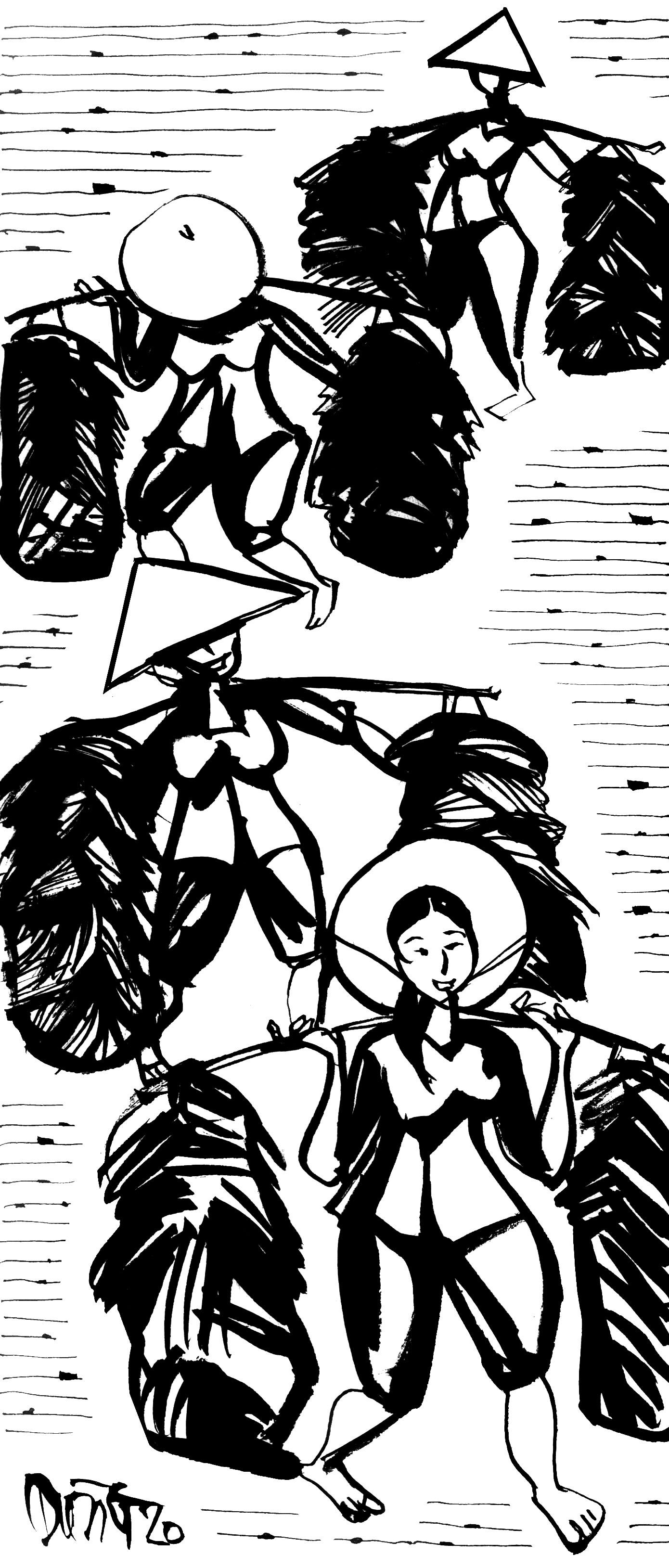 Làng nghèo nhưng trâu bò nhà ai cũng béo, có cỏ ăn quanh năm. Những khuôn mặt con gái làng tơ non luôn bịt kín khăn bông, hát thầm dưới nón. Những cái lưng con gái không làm dáng luôn cúi xuống chăm chỉ dọc những bờ đầm, bờ ruộng. Chiều về, đoàn quân cắt cỏ tụ họp lại ở bến sông vui tươi náo nhiệt. Bọn nào cắt cỏ dính bùn đất thì phải rửa cỏ, bọn cắt cỏ khô nơi đồng cao thì xếp gánh, ngồi trên bờ tán chuyện. Kê cái đòn gánh để ngồi lên, đứa nào đứa ấy tháo hết nón, khăn che mặt và áo mặc ngoài ra. Những mái tóc đen nhánh buông xuống che những cái má hồng rực, tươi trẻ.