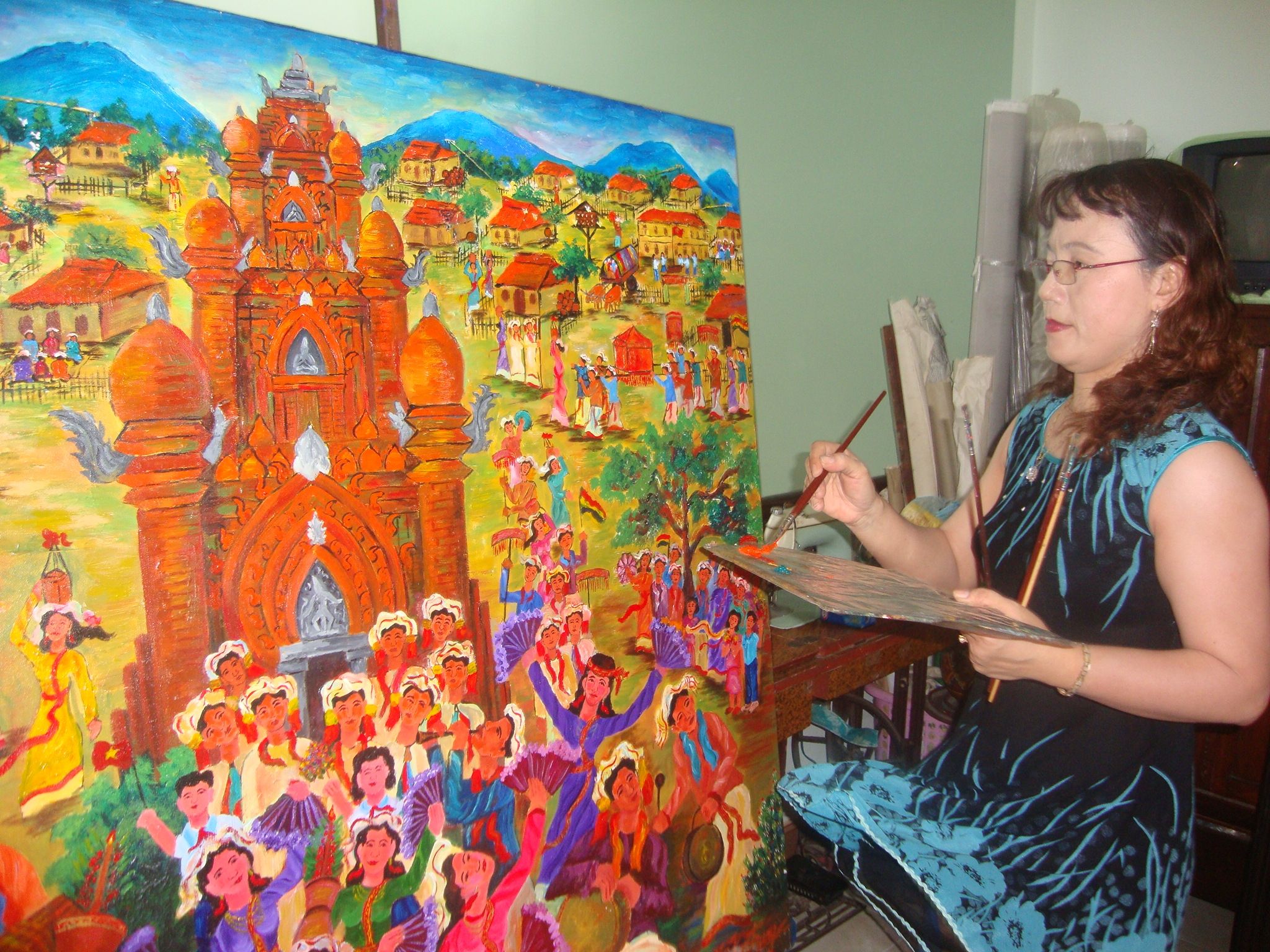 Khi gặp họa sĩ Chế Kim Trung tôi mới hay, chị đến với hội họa không dễ dàng chút nào, với niềm say mê như bị trời đầy vậy. Nhìn hàng trăm tác phẩm trên những bình, đĩa, tranh gốm mới hay sức làm việc của chị thật “vô thường”. Đúng với nghĩa đó là sự vận động uyển chuyển của sắc mầu, đường nét không cái nào giống cái nào. Gõ lên mỗi chiếc bình là một âm thanh vang lên với giai điệu mới. Bởi mỗi chiếc bình được chăm chút từ bàn tay nhỏ bé và kiên nhẫn của cô gái Chăm này. Chị kể đã bao ngày trở về với làng gốm Bầu Trúc và làng dệt Mỹ Nghiệp để học nghề làm gốm và dệt vải thổ cẩm. Tuy rằng đó cũng là công việc của một giáo viên, hàng ngày chị phải lên lớp giảng dậy học sinh về mỹ thuật và những đặc trưng của vẻ đẹp Chăm, nhưng Chế Kim Trung luôn ấp ủ những hoài bão sáng tạo mỹ thuật trên gốm, trên thổ cẩm. Và, còn đi xa hơn nữa, Chế Kim Trung đã vẽ trên gốm và đưa được những hình tượng về đời sống Chăm vào thổ cẩm. Bởi chị chính là một nữ họa sĩ trẻ tài năng đầu tiên của người Chăm, với nhiều thành tích đáng trân trọng. Nhưng có lẽ với gốm, Chế Kim Trung dành tâm huyết để làm mới gốm Bầu Trúc, sau hàng trăm năm đã ổn định. Do vậy mỗi tác phẩm trên gốm của Chế Kim Trung có độ du dương của sắc màu, trên nền đất đỏ xứ sông Quao, bên làng Bầu Trúc. Khi xem hình ảnh vũ nữ Apsara được phác thảo trên bình gốm, tôi bỗng nhớ đến câu thơ nổi tiếng của Chế Lan Viên viết về xứ sở Chăm rằng: “Cả trời đất đêm nay tràn ánh sáng. Bên Chiêm nương ta say uống nguồn mơ” (Ánh sáng). Vẻ đẹp kỳ ảo ấy đã hiện về trên gốm mà họa sĩ Chế Kim Trung đã làm bật lên giấc mơ của thi sĩ xúc động bên cô gái xinh đẹp người Chăm. Nhìn hình ảnh tháp Chăm nổi trên vòm cong của chiếc lu đỏ, tôi như được sống trong nét huyền bí của những lễ hội Chăm, cùng tiếng kèn Saranai lảnh lói. Đó là một phần sáng tạo từ hàng chục tác phẩm hội họa về Lễ hội của Chế Kinh Trung. Chị nổi tiếng về sắc màu lễ hội, với nhiều đề tài khác nhau, trong văn hóa Chăm ở xứ Ninh Thuận. Đó chính là Tháp Chàm đầy ảo mộng và hoan ca cho một thời kỳ huy hoàng của lịch sử đất nước Chăm, cách đây ngàn năm.