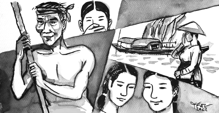 Năm đó lụt lớn vô kể, trăm năm mới có một lần. Ông ấy, nghe nói quê tận đâu miệt sông Tranh, sông Vàng thì phải. Với ổng, trận lụt cứ như một cuộc chơi. Lũ xuống gào thét, hù dọa, ông chỉ cười rồi nhún vai: “Sắp được một chuyến đi chơi thú vị đây!”. Nói xong, ông vần chiếc chum, bỏ thêm vào đó bộ quần áo rồi nhảy vào chum xuôi theo con nước. Chín ngày, chín đêm sau, ông cập bến Sông Hoài, đập chum, diện bộ áo quần đẹp ngất, dạo phố. Ổng gặp tôi ngay bên bờ sông, lúc ấy, đang ngồi khóc ti tỉ. “Chồng con đâu? Chết hết rồi hử?”- Ông hỏi như quát. Tôi lắc đầu. “Bỏ đi rồi hử?”. Tôi gật. Nom cái vẻ mặt non choẹt cùng với cái bụng lùm lùm của tôi có lẽ ổng đã đóan được phần nào câu chuyện. Ổng nhổ nước bọt đánh xoẹt: “Mẹ nó! Thằng khốn!”. Tôi càng khóc to hơn. Ông điên tiết quát: “Khóc, khóc cái chi? Chơi cho sướng lắm vào. Trên đời này, thiếu chi thằng khốn nạn, không biết hử?”. Tôi nín khe. “Vậy là không còn ai tất?”. Tôi gật, rồi lắc. Ông ta thở daì. “Con mẹ nó! Hay là… cô về sống với thôi quách đi?”. Tôi trợn mắt nhìn ổng. Về với người đàn ông xấu xí lạ lắc này? Có họa điên! Ráng chờ anh ấy quay trở lại? Anh ấy có trở lại không? Đã ba ngày rồi còn gì! Đẹp ngất trời như anh ấy mà khốn nạn thật hay sao? Mình không tin, không thể tin. “Nào đứng dậy, đi theo tôi! Theo tôi cô sẽ không khổ đâu mà sợ”. Từ cái buổi sáng mùa đông oái ăm đó tôi nhắm mắt đi theo ổng như xuôi theo sự sắp xếp của trời đất, của số phận. Chúng tôi về Trà Nhiêu. Ổng dựng nhà, mở quán giúp tôi sinh con và nuôi dạy nó. Tưởng đâu sẽ ăn đời ở kiếp. Vậy mà, ổng nỡ bỏ tôi mà đi…