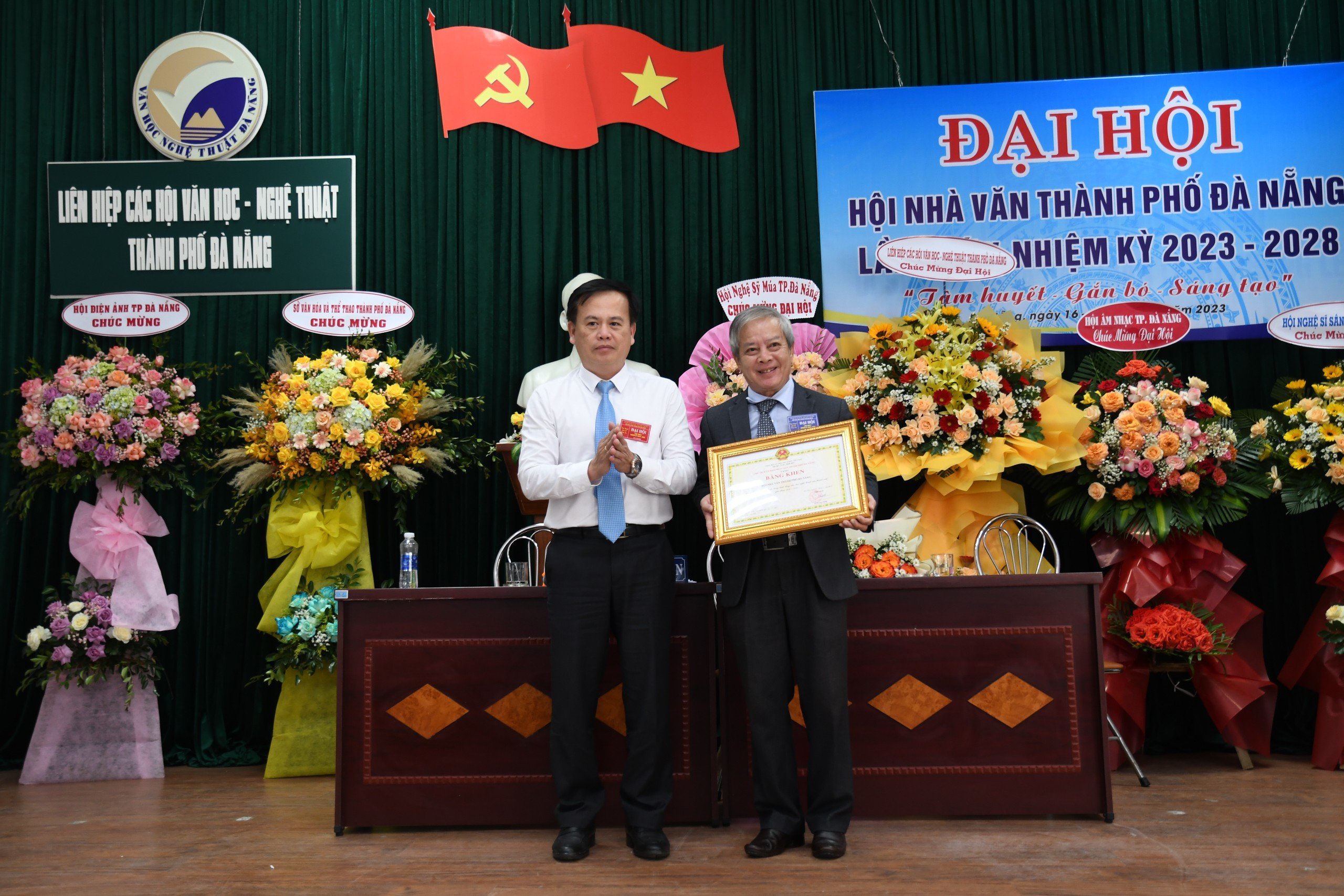| Thừa lệnh Chủ tịch Ủy ban Nhân dân thành phố Đà Nẵng, Ông Nguyễn Hoài Nam - Phó Trưởng Ban Tuyên giáo Thành ủy tặng Bằng khen cho Hội nhà văn thành phố vì đã có thành tích xuất sắc trong nhiệm kỳ 2018-2023. |