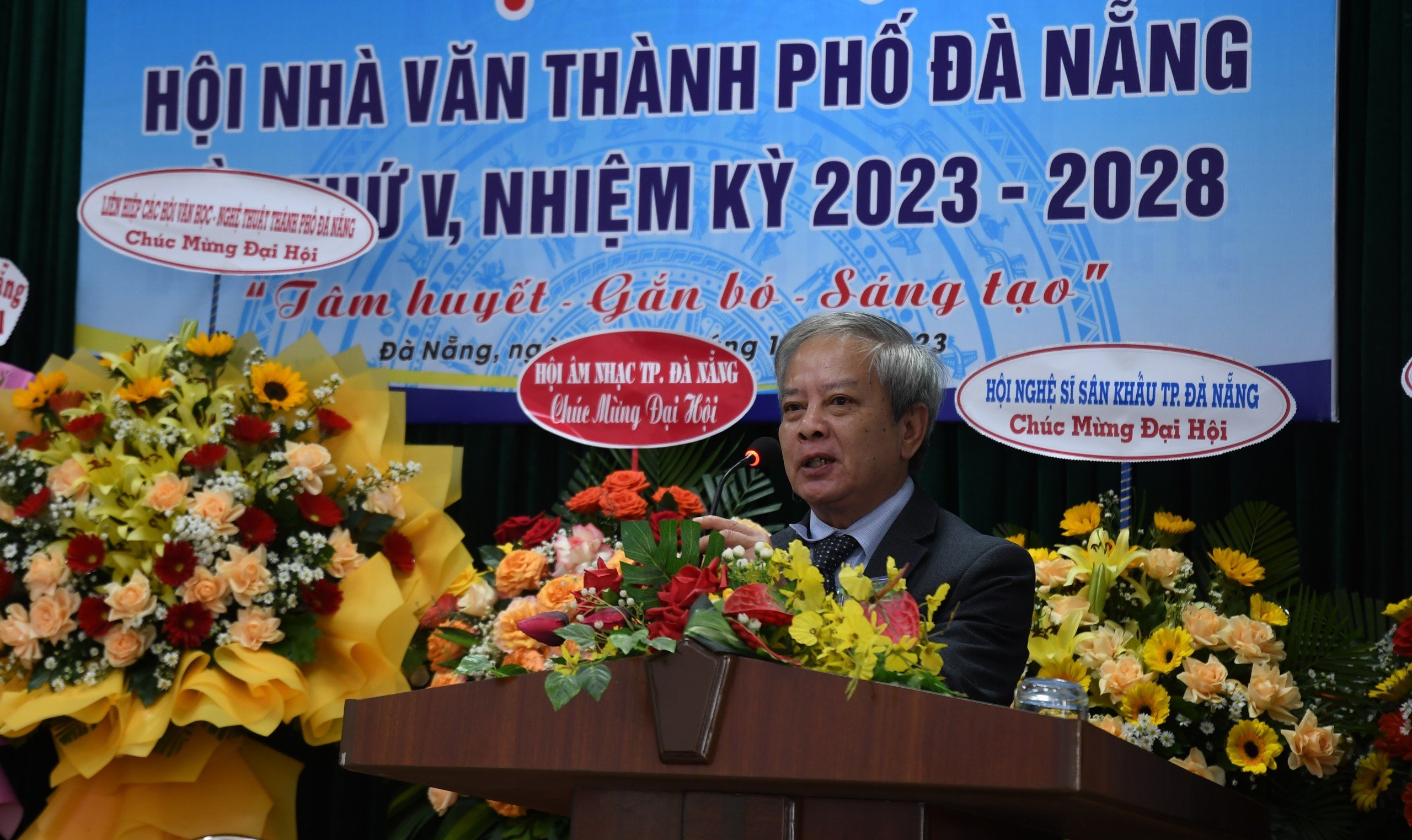 Nhà nghiên cứu Bùi Văn Tiếng - Bí thư Đảng đoàn, Chủ tịch Liên hiệp các Hội Văn học - Nghệ thuật phát biểu khẳng định và biểu dương những đóng góp tích cực của Hội Nhà văn thành phố trong nhiệm kỳ qua. Trong nhiệm kỳ 2023-2028, Ban Chấp hành mới cần thực sự đứng mũi chịu sào hướng về đại cuộc theo tinh thần tâm huyết, gắn bó, sáng tạo cùng nhau đoàn kết tổ chức thực hiện tốt nhất Nghị quyết của Đại hội nhiệm kỳ 2023-2028. Mỗi hội viên cần phát huy cao nhất năng lực sáng tạo nghệ thuật, vừa phục vụ nhiệm vụ chính trị của địa phương với tư cách những công-dân-nghệ-sĩ, vừa phục vụ cho sự phát triển của bản thân nghệ thuật ngôn từ, góp phần xứng đáng vào việc xầy dựng thương hiệu Đà Nẵng luôn trân trọng với văn chương.