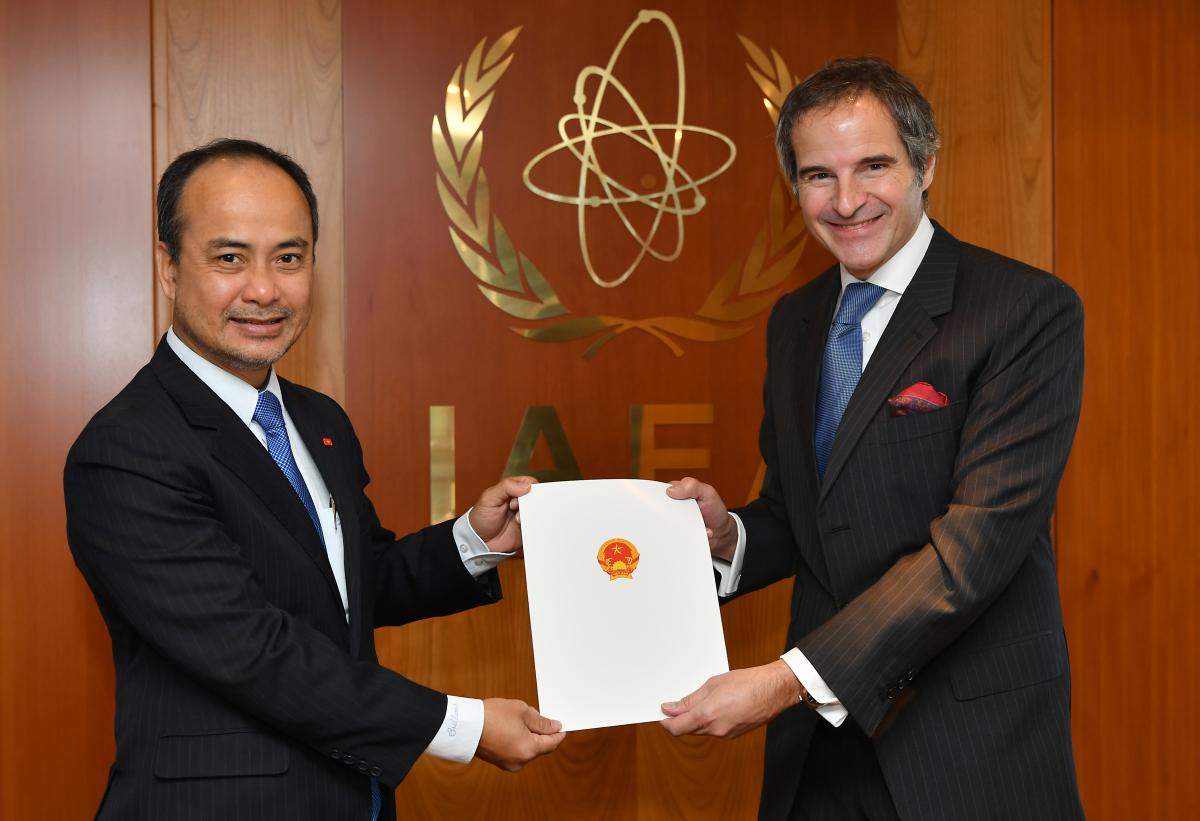 | Đại sứ Nguyễn Trung Kiên, Đại diện thường trực Việt Nam tại Cơ quan Năng lượng nguyên tử quốc tế (IAEA) đã trình Ủy nhiệm thư lên Tổng Giám đốc IAEA Rafael Mariano Grossi (Photo: Đại sứ Quán Việt Nam tại Áo) |