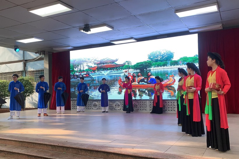 | Tiết mục hát dân ca quan họ Bắc Ninh trong buổi sân khấu hóa VHDG của Trường THPT Nguyễn Trãi. |