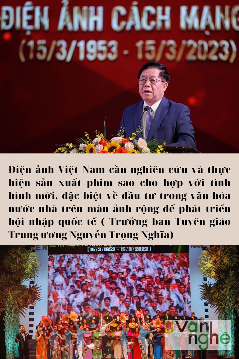 Phát biểu tại buổi lễ, Bí thư Trung ương Đảng, Trưởng ban Tuyên giáo Trung ương, Nguyễn Trọng Nghĩa nhấn mạnh Đảng và Nhà nước luôn quan tâm đến văn hóa nghệ thuật, hỗ trợ phát huy tiềm năng sáng tạo, thể chế hóa nghị quyết nhằm phát triển ngành công nghiệp điện ảnh việt nam hiện đại đậm bản sắc dân tộc. Đồng chí cũng ghi nhận, biểu dương những thành tựu to lớn của Điện ảnh cách mạng Việt Nam và nhấn mạnh kho điện ảnh Cách mạng nước ta đã có nhiều tác phẩm mạng đậm bản sắc dân tộc, đáp ứng được các nhiệm vụ chính trị, kinh tế, xã hội. Các nhà làm phim cũng đã cố gắng triển khai các đề tài về xu thế cách mạng, hồi ức chiến tranh, thân phận con người được miêu tả sâu sắc nhân văn, có nhiều đóng góp xuất sắc cho sự nghiệp cách mạng và nền văn học nghệ thuật nước nhà. Đồng thời đã xác lập nên vị thế của một nền điện ảnh tiến bộ, nhân văn, đi đầu trong cuộc đấu tranh giải phóng dân tộc và vì lẽ sống cao đẹp của con người.