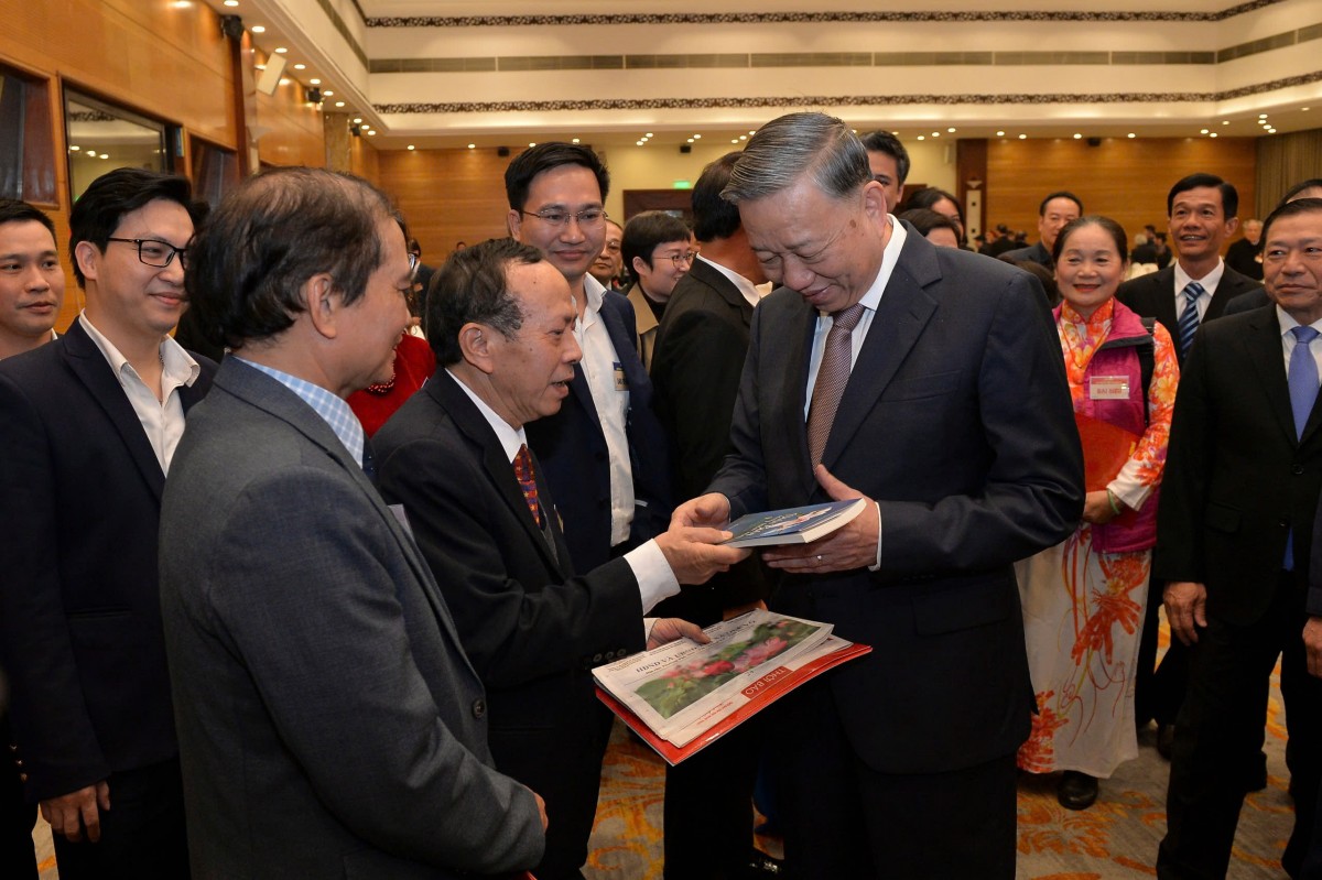 | Nhà văn, nhà báo Hoàng Dự tặng tác phẩm "Điện Biên sáng xuân này" của nhà văn Châu La Việt tới Tổng Bí thư Tô Lâm tại buổi gặp mặt văn nghệ sĩ ngày 30/12/2024 |