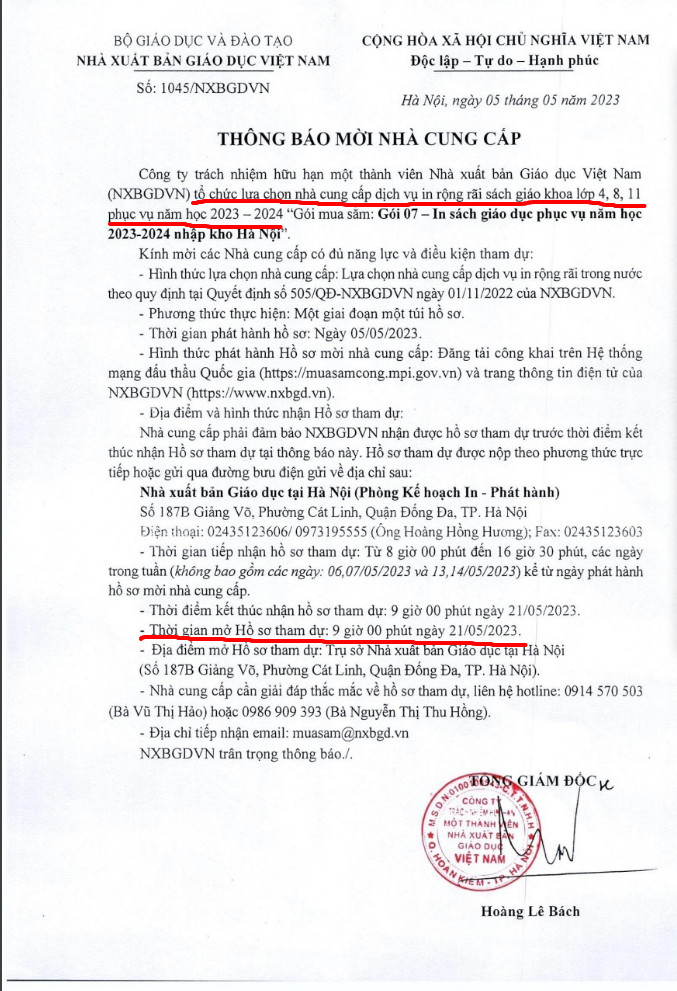 Theo các thông báo này, thời điểm mở hồ sơ dự thầu là 9h ngày 21/5/2023. Nghĩa là còn tới gần 10 ngày nữa, NXBGD mới tổ chức lựa chọn nhà cung cấp dịch vụ in rộng rãi sách giáo khoa lớp 4, 8, 11 phục vụ năm học 2023 – 2024 theo hình thức đấu thầu và nhập các kho tại Hà Nội, Tp.Hồ Chí Minh, Đà Nẵng và Cần Thơ.