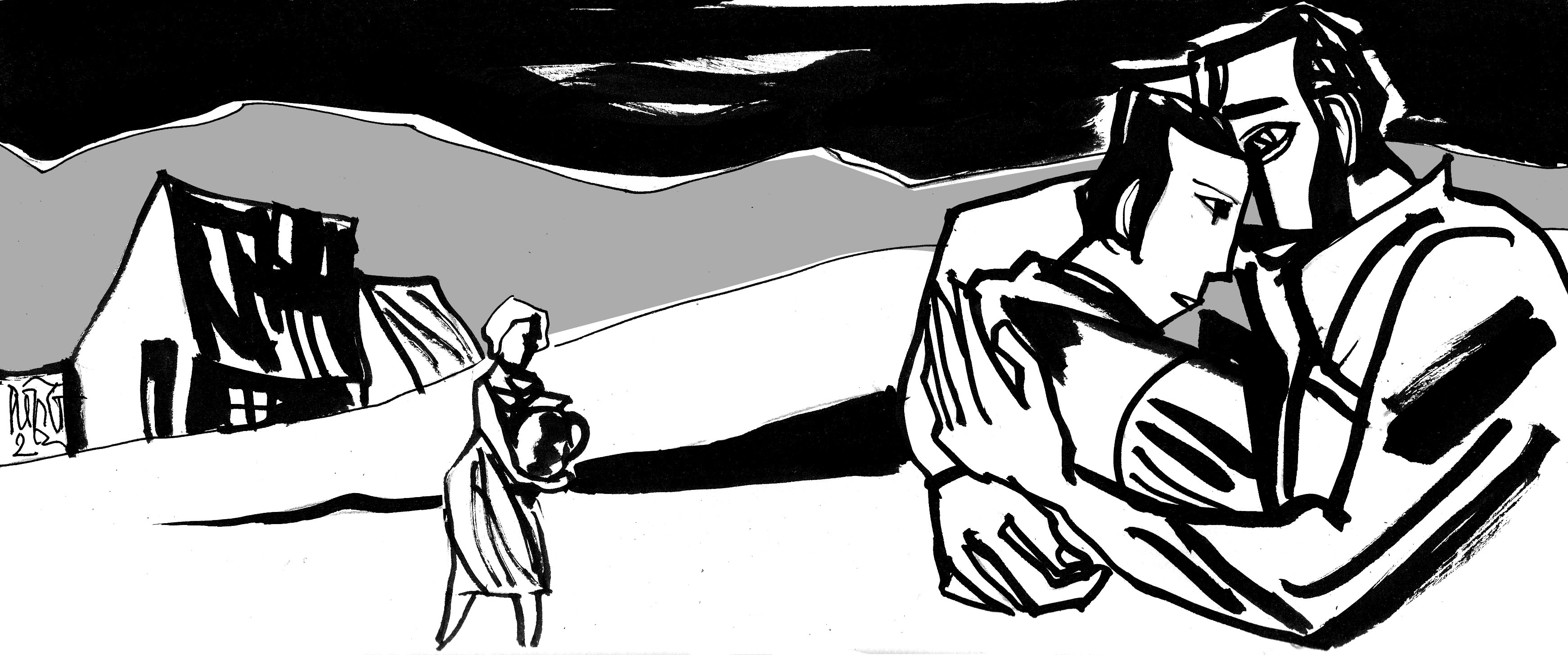 Rồi đột nhiên, không kiểm soát được chính mình, anh bật khóc một cách thảm thương. Nước mắt chảy dài như thác nước, nhớ về tuổi thơ, tuổi trẻ, cuộc sống gia định ngắn ngủi của mình, anh đứng trước cửa nhà. Lấy hai tay che lại khuôn mặt thảm thương, anh khóc nức nở suốt quãng đường cho tới khi thấy nhẹ lòng. Sau đó, anh tỉnh táo lại một chút. Để người qua đường không nghi ngờ điều gì, anh lấy khăn tay ra lau nước mắt và chăm chú nhìn vào ngôi nhà. Ngôi nhà trông vẫn vậy, chỉ khác là bức tường đã được quét vôi trắng, cửa sổ được sơn lại và ngôi nhà được phủ một lớp gốm trang trí. Khu chuồng nuôi gia súc vẫn vậy, không thay đổi chút nào, chỗ chuồng gà được mở rộng hơn một chút. Những tán cây đã được anh trồng xong, vườn nho xưa cũng tự tay anh làm. Vườn nho lá rộng phủ kín bề mặt. Phía bên dưới được đặt một cái quầy và một cái bàn. Cây dâu do bố anh trồng đã che chở cho những tia nắng mắt trời. Anh nhớ lại cách uốn một cành cây nhỏ, ăn tutu, hát những bài hát, và vui vẻ nô đùa với bạn bè.