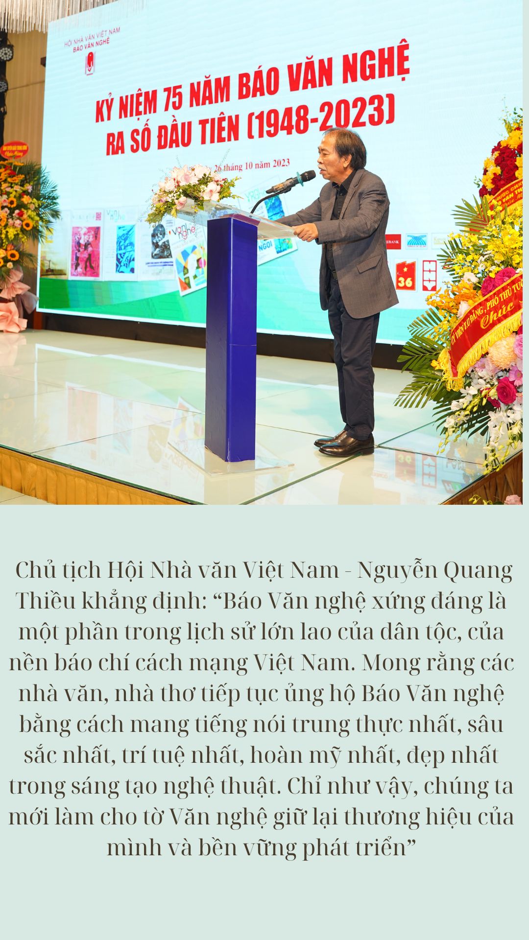 Phát biểu tại Lễ kỷ niệm, Chủ tịch Hội Nhà văn Việt Nam - Nguyễn Quang Thiều khẳng định: “Báo Văn nghệ xứng đáng là một phần trong lịch sử lớn lao của dân tộc, của nền báo chí cách mạng Việt Nam. Mong rằng các nhà văn, nhà thơ tiếp tục ủng hộ Báo Văn nghệ bằng cách mang tiếng nói trung thực nhất, sâu sắc nhất, trí tuệ nhất, hoàn mỹ nhất, đẹp nhất trong sáng tạo nghệ thuật. Chỉ như vậy, chúng ta mới làm cho tờ Văn nghệ giữ lại thương hiệu của mình và bền vững phát triển”.