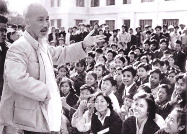 | Chủ tịch Hồ Chí Minh nói chuyện với học sinh Trường Nghệ thuật Sân khấu Trung ương ở Khu Văn công Mai Dịch, Hà Nội. Ảnh T.L |