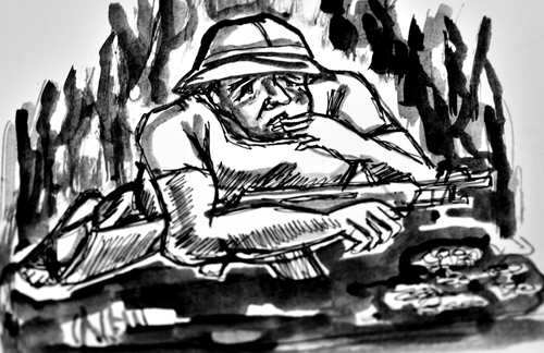 Người lính già đau đớn ôm ngực ho rũ rượi. Chiếc bút rơi xuống, mực của nó chảy ra loang hết sàn gạch đỏ đã biến thành màu xanh Cửu Long.