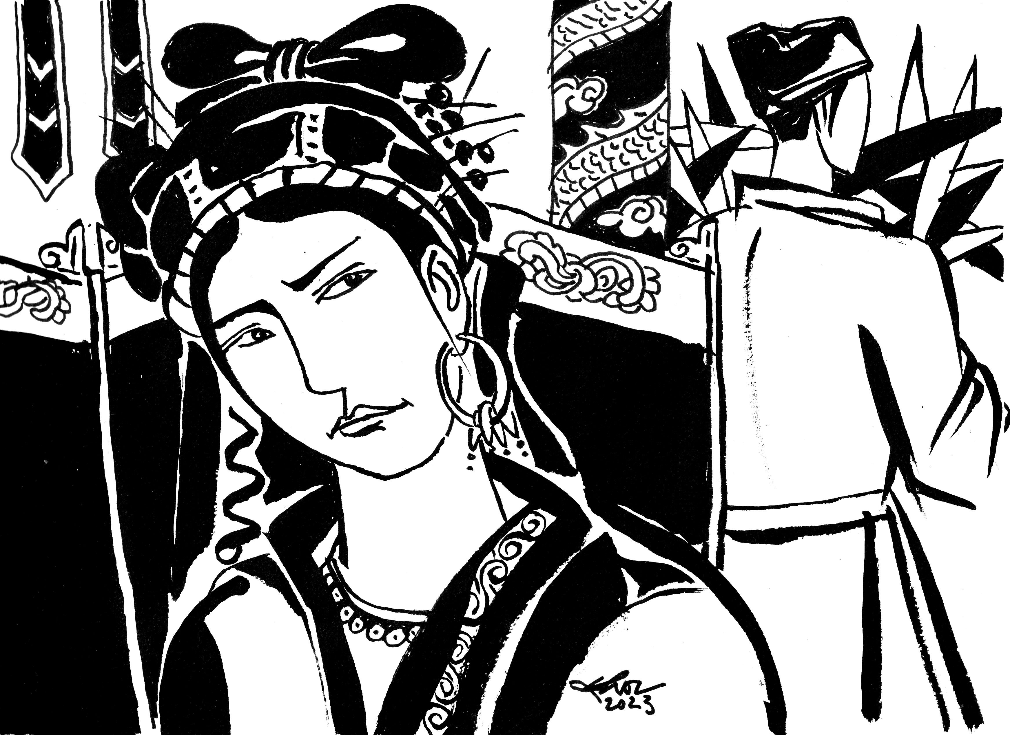 Lê Sơn cáo từ. Bóng chàng mất hút trong bóng tối mịt mùng. Thần phi ngậm ngùi nhìn theo, chạnh lòng nhớ tiếc. Đây không phải là lần đầu tiên nàng có tâm trạng ấy. Trong cung cấm, nhiều đêm phòng không vắng vẻ, nằm một mình trên nệm ấm chăn êm, lệ trào ước má. Kỉ niệm xưa hiện về rung động cả người. Nàng nhớ những chiều thơ mộng, trên bờ sông quê thân thuộc, ngồi tựa vào nhau nhìn dòng nước êm đềm lững lờ trôi, cùng thêu dệt bao hoa mộng. Nhớ giây phút ái ân nồng cháy ngất ngây. Nhớ lúc chia li chết cả cõi lòng… Thật tình, những ngày tháng sống bên cạnh Lê Sơn là khoảng thời gian đẹp nhất đời nàng, không bao giờ quên được… Tâm tư Thần phi bỗng xao động. Bất giác, nàng cất tiếng thở dài…