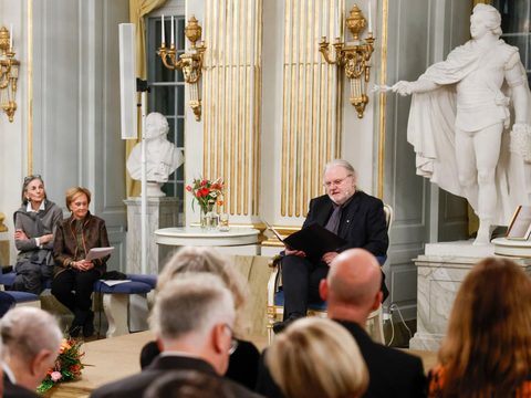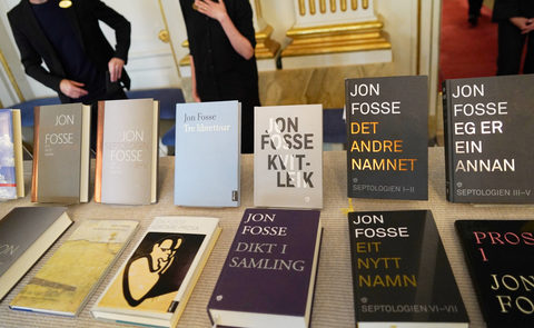 | Jon Fosse đọc diễn từ nhận giải tại Oslo. Ảnh Fredrik Persson. |