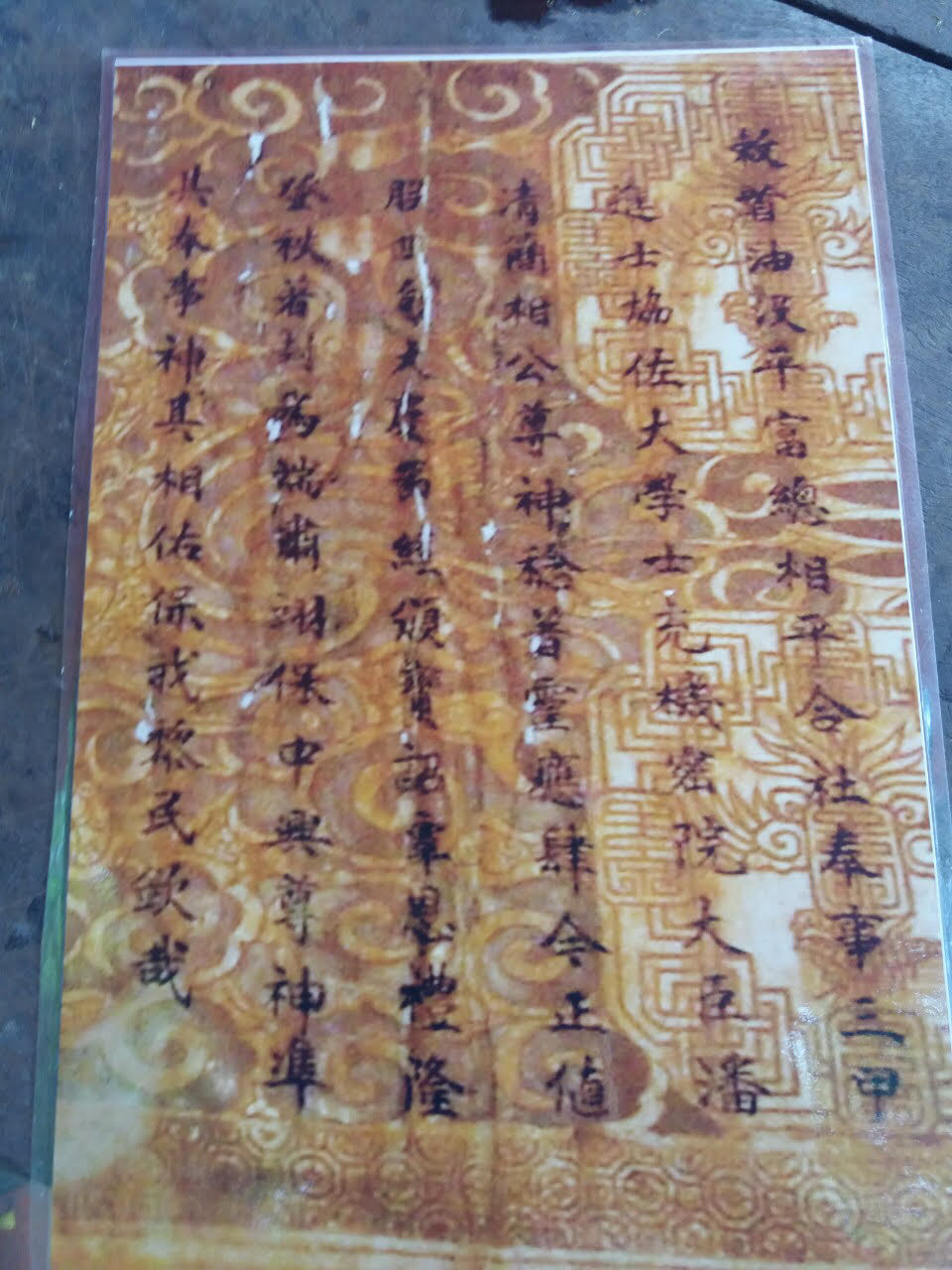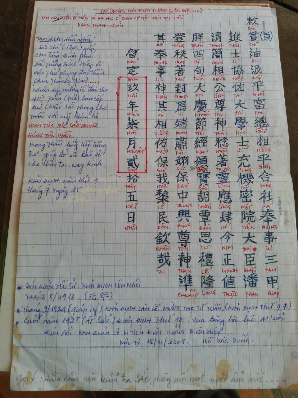 | Bản sắc phong thần hoàng Phan tướng công linh thần của vua Khải Định ( bên trái) và bản dịch( bên phải) |