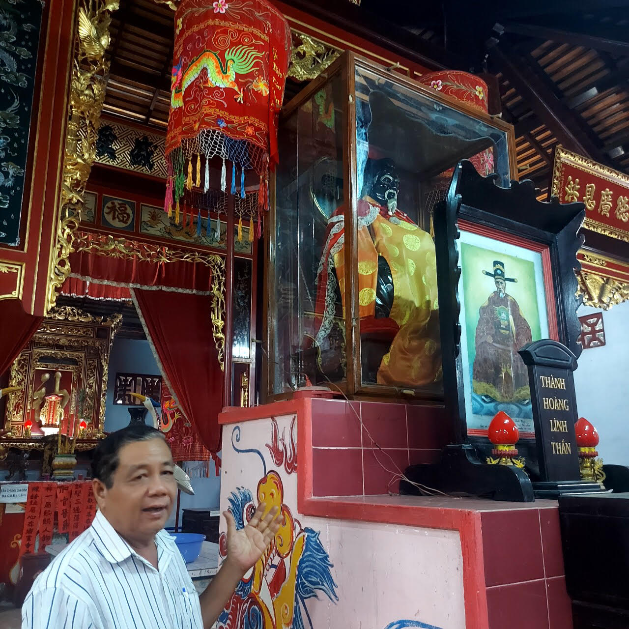 | Ông Phan Văn Hữu, Trưởng ban quản lý di tích kiêm trưởng ban húy tế đình trước tượng và ảnh chân dung Đại thân, danh sĩ Phan Thanh Giản. Ảnh : L.A.D |