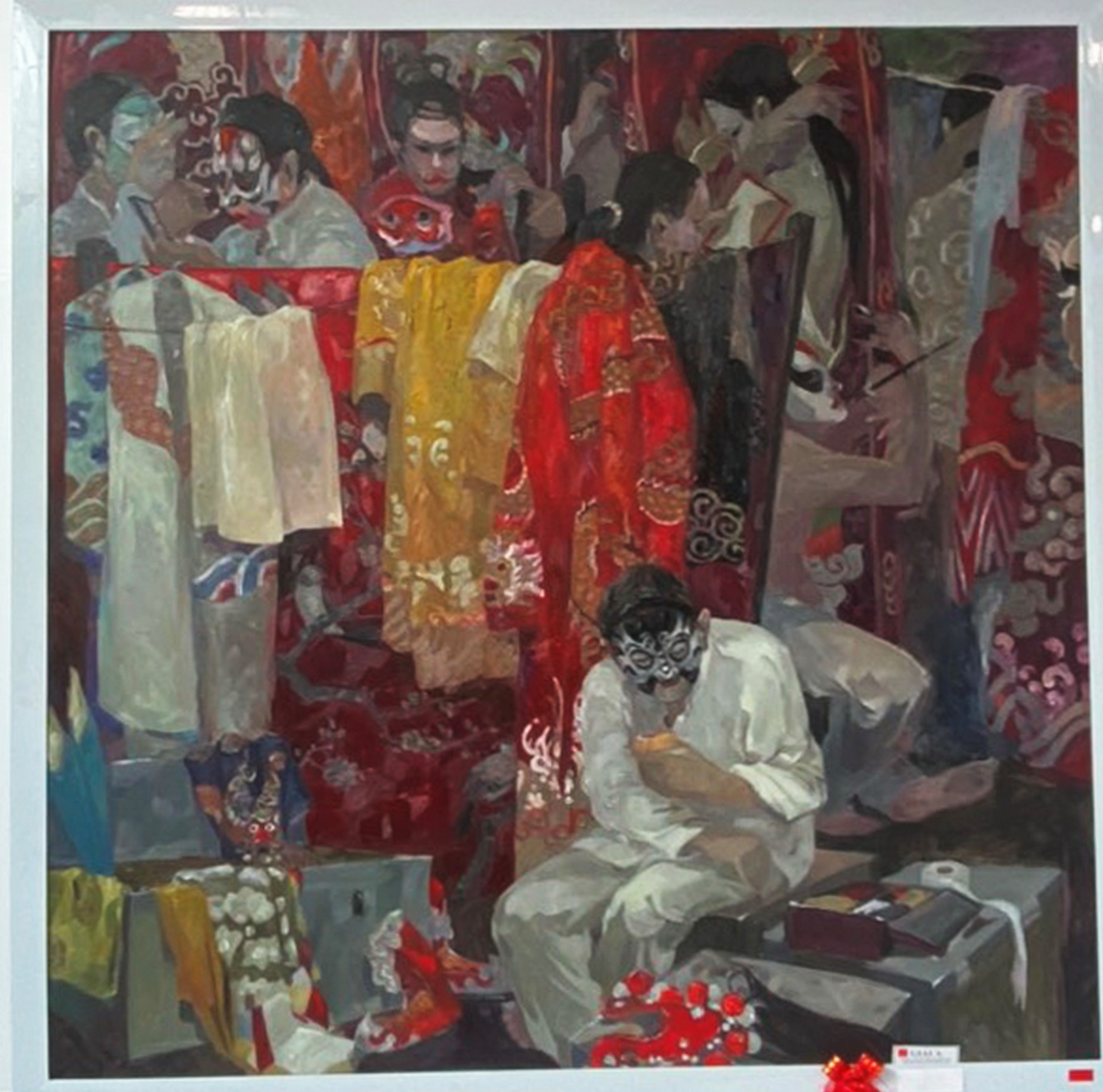 Hát bội – tác phẩm được giải A của triển lãm, nhận được rất nhiều lời ngợi khen. Với nỗ lực sáng tạo không ngừng nghỉ cho một chủ đề đã “đi vào trong tiềm thức, trong máu thịt của tôi, từ lúc còn ngồi trên ghế giảng đường”, họa sỹ Lê Nguyên Chính bất ngờ mang đến cho công chúng khám phá riêng của anh, góc nhìn vào phía sau cánh gà của nghề hát bội. Nhân vật chính của tác phẩm là vai Lão (người già), sau khi đã hoàn tất khâu hóa trang, diễn viên đang ăn vội lót dạ, chờ lên sàn diễn … Gương mặt đã được hóa trang nên không ai nhận ra diễn viên đang vui hay buồn, chỉ biết đó là một vai Lão… Cái tất bật, động thái sẵn sàng, chỉ chờ đến giờ “được” xuất hiện trước công chúng của diễn viên hát bội hiển hiện rõ trên tác phẩm. Nhưng thông điệp chính mà tác giả Lê Nguyên Chính – đã khéo léo được ẩn dụ - muốn nói, lại là câu chuyện nặng lòng…