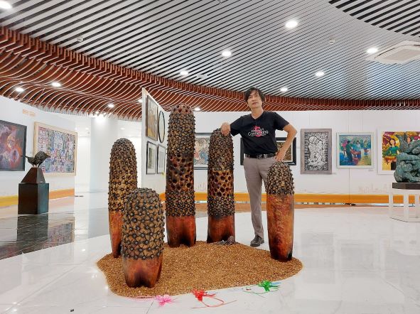| Tác giả Lê Trọng Nghĩa bên tác phẩm Bàn tay của đất. |
