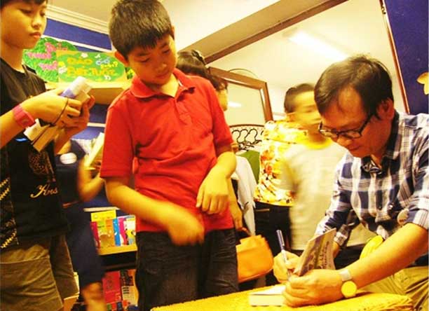 Nhà văn Nguyễn Nhật Ánh ký tặng bạn đọc nhỏ trong một sự kiện về sách. Ảnh: Hoàng Hoa