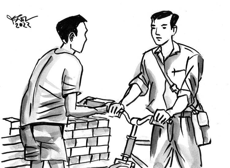 Một bữa anh mời tôi về nhà chơi. Nhà anh nghèo lắm, mà vợ anh lại đau ốm kinh niên. Hai cậu con trai còn nhỏ, đứa lớn mới cao bằng chiếc chum đựng nước, nhưng cũng phải ráng sức phụ với bố đào đất đóng gạch. Thế anh đóng gạch để chuẩn bị xây nhà phải không? Thấy tôi hỏi vậy, anh Sơn cười nhỏ nhẹ mà tươi lắm: