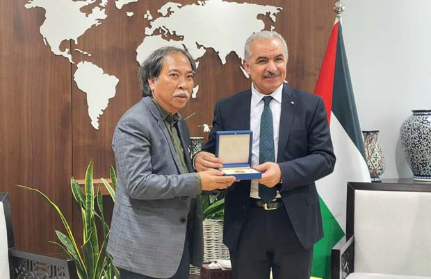 | Nhà thơ Nguyễn Quang Thiều (trái) nhận Huân chương cao quý nhất của Nhà nước Palestine |