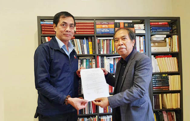 Nhà thơ Nguyễn Quang Thiều trao quyết định cho nhà thơ Hữu Việt