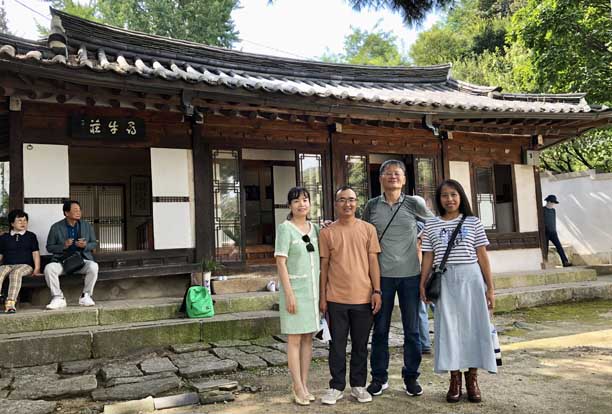 Các nhà văn trẻ Việt Nam và nhà văn Kim Nam Il –Chủ tịch Hội Những nhà văn Hàn Quốc yêu Việt Nam (thú 3 từ trái sang) chụp hình lưu niệm tại Nhà lưu niệm nhà thơ Han Yong Un ở Thủ đô Seoul.