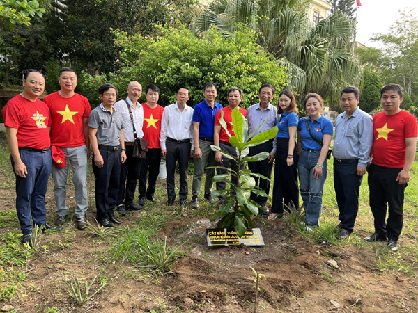 | Đồng chí Đào Minh Đông - Phó Bí thư huyện ủy - Chủ tịch UBND huyện cùng các đồng chí đại diện đoàn công tác trồng cây bàng vuông được Giám đốc Học viện Báo chí - Tuyên truyền tặng đảo Bạch Long Vĩ |