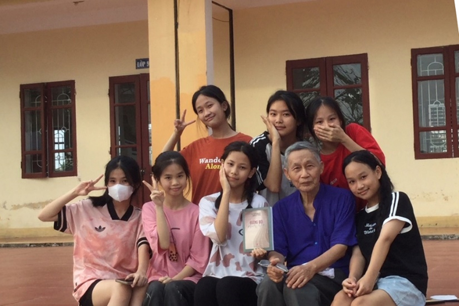 | Tác giả cùng tốp học sinh lớp 9 trên sân trường THCS Nguyễn Khắc Viện trước ngày khai giảng |