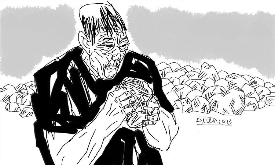 Bà con bấm nhau, xì xầm. Có khi lão Cục điên thật rồi cũng nên. Chắc là lão nhớ lại cái chết của vợ? Lão yêu vợ như thế; vợ lão lại bị đá rơi trúng mà chết. Có khi nào lão nghĩ quẩn đâm ra căm hận đá nên mới nhặt chúng về để trả thù? Nhưng... nếu như thế thì lão chỉ cần nhặt những viên đá nhỏ bằng nắm tay thôi chứ, vì kích thước hòn đá giết vợ lão cũng chỉ cỡ đó; đằng này lão lại “chọn lọc” cẩn thận như thế... Hơn nữa, nếu lão muốn trả thù đá thì lão phải làm gì đó, sao lại chỉ nhặt chúng đem về chất đầy nhà thế kia?