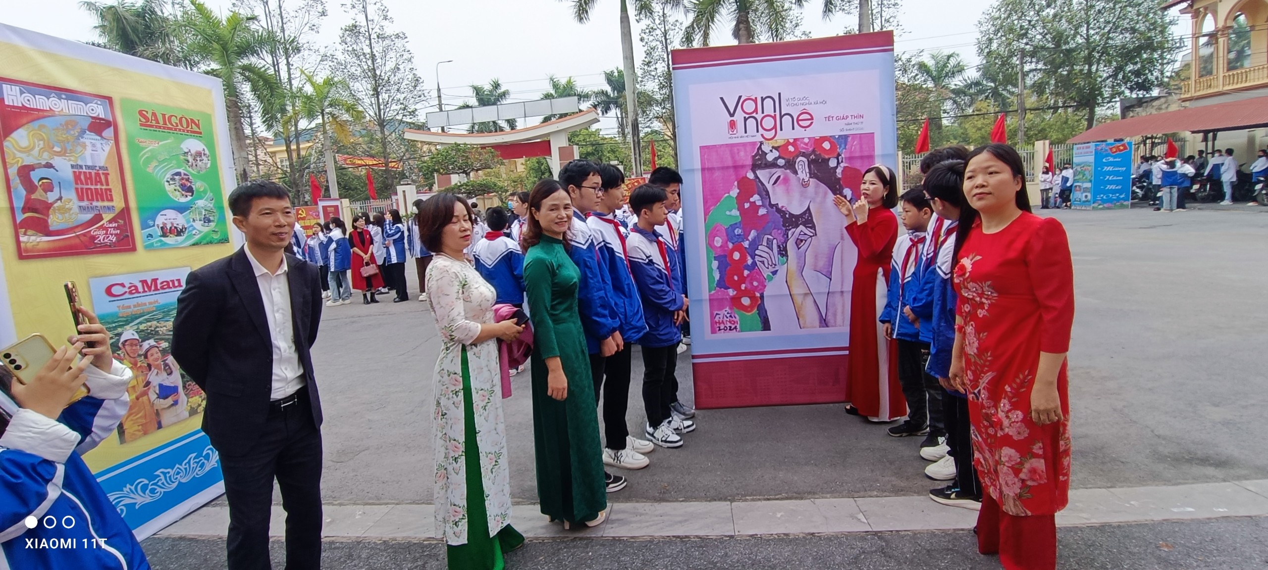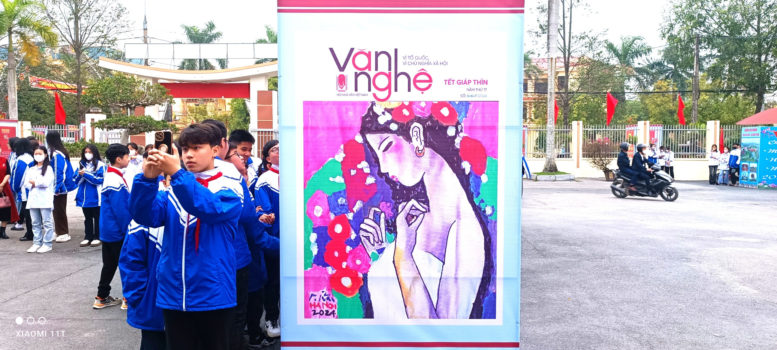 | Các đại biểu và bà con nhân dân, các em học sinh... bên poster bìa báo Xuân báo Văn nghệ |
