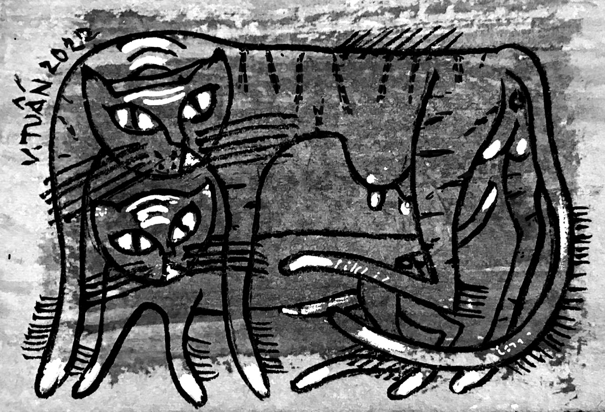 Thì ra con mèo vàng đã chui vào trong chăn ngủ tự khi nào. Nó bị sức nặng của cả hai chúng tôi đè lên. Đau. Nó gắng gượng quẫy đạp chui khỏi chăn và gào lên một tiếng váng động xung quanh. Nó gào to đến nỗi, chú Vũ bố Mai đang ngồi đan lờ ngoài sân phải buông tay chạy ra rặng tre quát sang: “Chúng mày làm cái trò gì với con mèo đấy???”