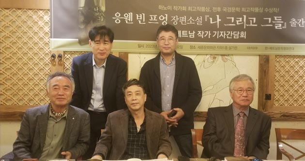 Nhà văn Nguyễn Bình Phương (giữa) và các đồng nghiệp người Hàn trong buổi ra mắt sách “Mình và họ”