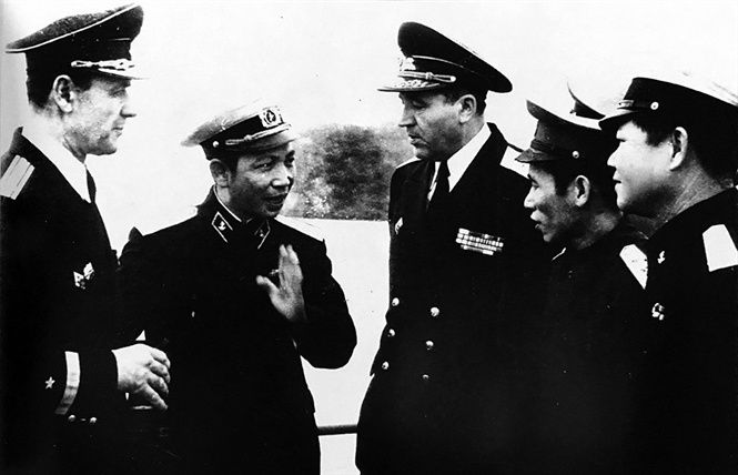 | Chuẩn đô đốc Trần Văn Giang (thứ hai từ trái qua) trao đổi kinh nghiệm với chuyên gia Liên Xô - Ảnh: ML |