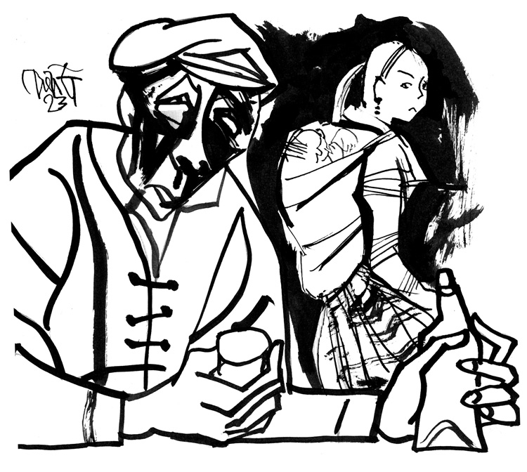 Cha nó lè nhè, không khí toàn hơi rượu.