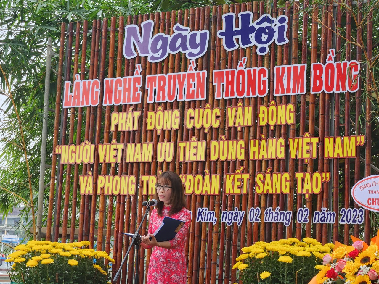 Bà Đỗ Thị Bích Thuỷ - Phó Chủ tịch UBND xã Cẩm Kim phát biểu tại lễ hội làng nghề Nghi thức đặc biệt thiêng liêng, được mỗi người dân làng Kim Bồng tôn kính, coi trọng nhất là Lễ cúng Tổ nghề Mộc, diễn ra từ sáng sớm ngày 12 tháng Giêng tại đình Tiền Hiền của Làng. Sau Lễ cúng tổ, bà con trong làng mới tề tựu về Trung tâm trưng bày làng nghề Kim Bồng, cùng nhau tham gia các hoạt động “hội” như: Hội đua thuyền, các trò chơi dân gian như bịt mắt đập niêu, cờ tướng, hát bài chòi; tham quan điểm trình diễn và trưng bày các sản phẩm của làng nghề, thưởng thức các món ăn truyền thống gắn bó hàng trăm năm với người dân địa phương…. Đây là những nét đẹp văn hoá của nghề Mộc gắn với các hoạt động sinh hoạt của cộng đồng Kim Bồng – Cẩm Kim hàng ngày được nhiều thế hệ người dân làng Kim Bồng đã cố gắng gìn giữ, trao truyền.